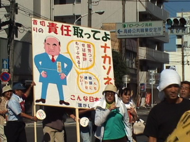 8月20日中曽根元首相のお膝元、高崎市内で。実家周辺の初めてのデモに地元警察も緊張したが、約50名のデモ隊は替え歌などを歌いながら「鉄建公団裁判に証人として出てこい」と気勢をあげた。