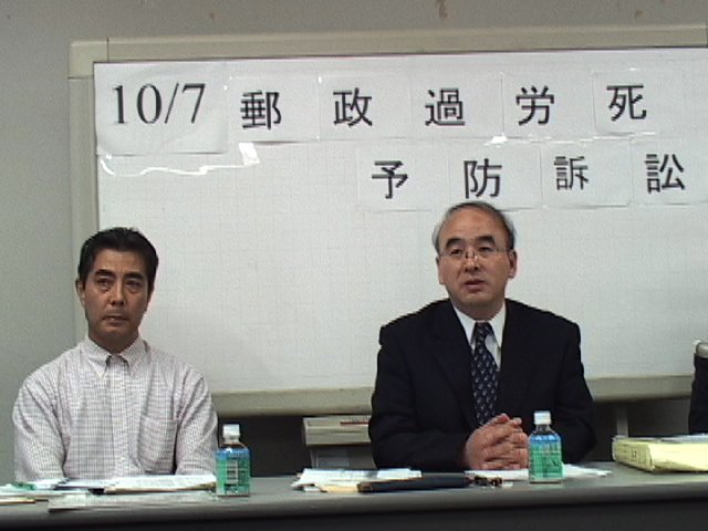10月7日、郵政公社が2月に導入した過酷な深夜連続勤務(2〜4回連続)に反対する2名の職員が、深夜勤の差し止めを求めて東京地裁に提訴した。(右/伊藤晴男・左/重富義明の各氏)。