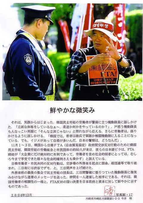 辺野古は緊迫した情勢。米軍基地建設をやめさせよう 沖縄県名護市辺野古の基地建設予定地では、防衛施設庁による建設強行が始められようとしている。現地での反対運動参加者とのにらみ合いが続いている。現地の非暴力抵抗と連帯して、なんとしてでも基地建設をやめさせよう。現地でのたたかいの様子は、 ちゅら海をまもれ!沖縄・辺野古で座り込み中! ジュゴンの家日誌・ シンさんの辺野古日記・ 沖縄テレビの動画・ 琉球朝日放送による動画に詳しい。 沖縄タイムス・琉球新報のサイトにも情報がある。 ボウリング調査阻止の要請はこちらへ イラク戦争のドキュメンタリー綿井健陽監督『Little Birds〜イラク戦火の家族たち』が劇場公開 イラク戦争を取材したドキュメンタリー映画が公開された。マスメディアでほとんど報道されない戦争の現実を伝える作品だ。憲法9条が改悪されようとしている今こそ、戦争の現実を知る必要があるだろう。 郵政の首切り26周年行動&東京上映会 フランスのたたかう歌声・ジョリモームの集い 郵政民営化を監視する市民ネット立ち上げ 1047キロキャラバンゴールイン グローバル社会における生産点のいま 木下昌明さんのウェブ版第4回映画時評を掲載した。取り上げた作品はNHKドキュメンタリー『フリーター漂流』。この作品は日本の労働現場の実態に鋭く迫っている。こちらへ 世界は"NO WAR"と言い続ける〜日比谷野音2日間で11000人 連帯労組関西生コン支部に新たな弾圧 1/13に続き、3/9全日建連帯労組関西生コン支部に新たな権力弾圧があった。4名の不当逮捕・強制捜索である。同労組は、正当な組合活動に対する弾圧・長期にわたる運動つぶしであるとして、抗議声明を発表した。こちらへ 鉄建公団訴訟が結審・判決は9月15日に レイバーネット日本第5回総会成功裏に終了 レイバーネット日本第5回総会は3/5(土)午後、東京しごとセンターセミナー室で開催された。約30名が参加し、今年の計画など活発にディスカッションした。第二部ではアメリカの労働者文化運動の実態を知ることができた。詳報・写真 国鉄解雇訴え1047キロマラソンスタート NTT木下闘争支援共闘会議結成される 雨にもまけず2・16東京総行動 けんり春闘がスタート 世界社会フォーラム1/26〜31に開催 ポルトアレグレからの報告 1 2 3 4 5 6 7 ポルトアレグレからの写真 1 2 3 4 5 6 7 8 9 世界社会フォーラム反戦総会の呼びかけ 鉄建公団訴訟・50万人署名を開始 1047名の国鉄労働者の不当解雇問題を東京地裁で争っている鉄建公団訴訟が3/7に結審し、5月にも判決が出ることになった。18年に及ぶ長期争議の最大の山場を迎えている。原告団は、労働者救済の公正な判決を求めて50万人署名を開始した。ぜひ皆さんのご協力を訴えたい。電子署名・ともにGO!のサイト 今井明の写真館NO.16〜20を発表 報道への政治家の介入を許すな!戦争責任を明らかにする運動を前進させよう! 女性国際戦犯法廷を扱ったNHKの番組に自民党の安倍晋三、中川昭一両議員が圧力をかけて内容を改竄させたことが明るみに出た。改竄の内容は、日本の戦争責任を明確にした部分であり、報道への圧力であるばかりか、歴史への圧力ともいえるものである。NHKと両議員は事実無根と開き直っているが、断じて許されない。内部告発した勇気ある労働者を守ろう。戦争責任を明らかにする運動をさらに前進させよう。NHKの労働組合・日本放送労働組合のウェブサイト/「戦争と女性への暴力」日本ネットワークのウェブサイト/この問題をスクープした朝日新聞のウェブサイト 1/25に『郵政クビ切り物語』試写会 郵政の25年におよぶ4・28不当処分撤回闘争の記録が映像作品になった。全逓労組が御用化され、郵政の職場が民営化を先取りする過酷な職場実態になっていることも描かれている。1/25(火)東京しごとセンターで完成試写会が開催された。約50名が参加し好評だった。2/13大阪上映をはじめ、全国上映をすすめる予定。写真は高裁勝利判決を喜ぶ免職者の池田さんと名古屋さん。詳細 以前のトップページ [8] [7] [6] [5] [4] [3] [2] [1] | ||||