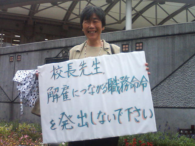 「君が代」不起立を理由に「停職6月処分」を受けた根津公子さん(中学教員)は、10月1日、半年ぶりに転勤先の南大沢養護学校に出勤した。支援者20名弱が、プラカードを手に見守った。根津さんは「仕事ができると思うとうれしくて今朝まで眠れなかった」と語った。石原都政の累積処分で08年3月には解雇も予想されるが、きたる10月5日には、抗議の都庁前One dayアクションが行われる。この日はサンフランシスコでも米国教員らが連帯行動を起こす。写真1・写真2・10/5アクション・根津さんの手紙