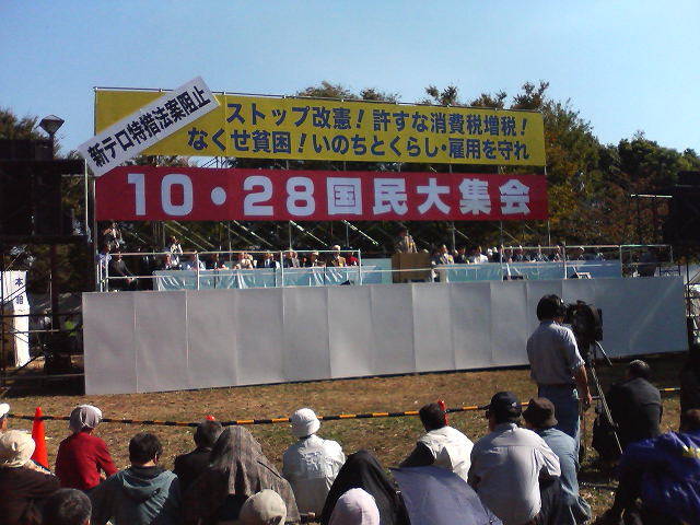 10月28日、東京・亀戸中央公園で数万の人を集めて「10・28国民大集会」が開かれた。主催は全労連などの実行委員会。全国からさまざまな労組が参加し、改憲阻止・増税反対・格差の是正などのスローガンを掲げた。反貧困ネットの湯浅誠さんらが連帯の挨拶を述べた。たたかいの報告では、首都圏青年ユニオンに入ったばかりの20代の柳さん(美容師)が、業界の長時間労働の実態と自らの闘いを報告した。写真・首都圏青年ユニオンインタビュー
