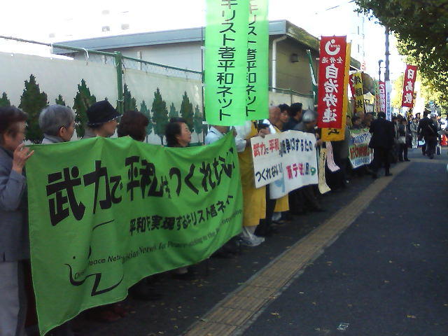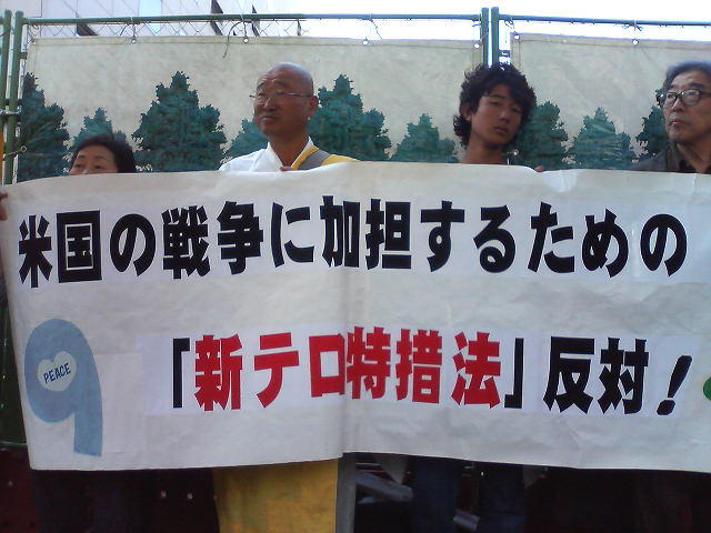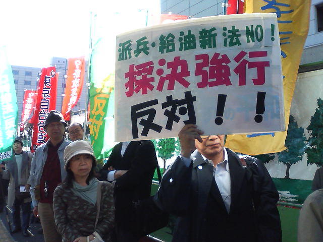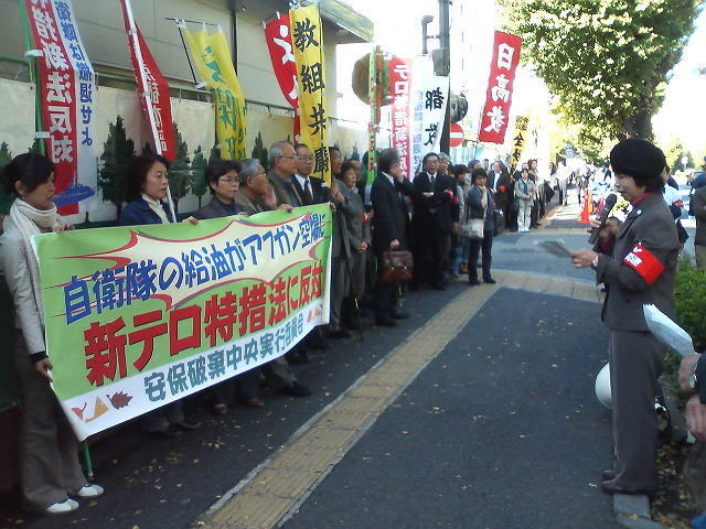 11月12日昼、給油新法(新テロ特措法)の衆院委員会採決に抗議して、約200人の人々が国会前で声を上げた。集まったのは、全労連系の組合員、憲法・宗教・女性などの市民団体、「9条改憲阻止の会」のメンバーなど。市民連絡会の高田健さんは「いま自衛隊は期限切れでインド洋から引き上げている。これは画期的な出来事で、米国の戦争に加担するな、という私たちの運動と民意がこれを実現させた。再び派兵をさせないために、参院で運動を強めよう」と訴えた。 写真1・写真2・写真3・写真4・風刺漫画(壱花花)