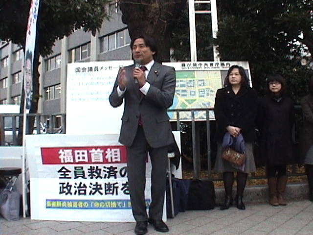12月19日、川田龍平議員は薬害肝炎訴訟で被害者全員救済を求める緊急行動を起こした。社民・共産・民主などの議員も同調した。昼には、原告団と共に官邸前で福田総理に決断を迫るアピールを行った。多数のテレビクルーと支援者で、官邸前の歩道はふくれあがった。大阪から来た原告の女性はマイクを握り「5年たたかってきて限界。もう命の時間がない。同じ被害を受けた者を差別しないでほしい。被害者全員救済の政治決断を福田総理に今日中にしてほしい」と強く訴えた。写真は原告の女性たち。 他の写真