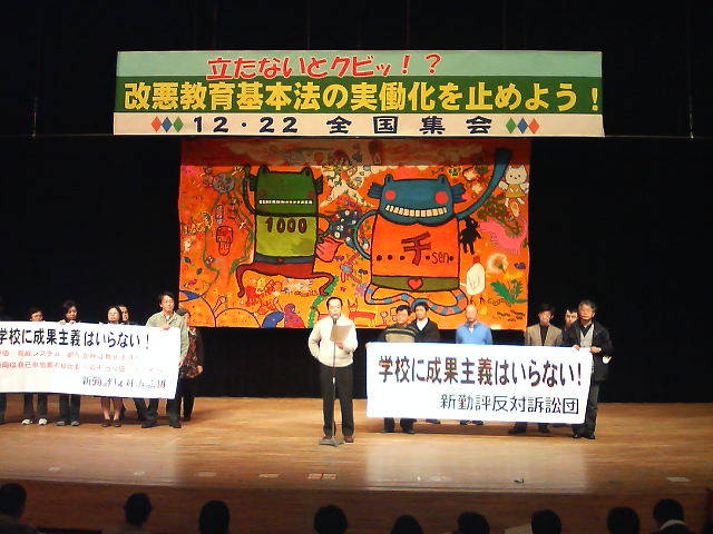 12月22日、東京・北とぴあで「立たないとクビッ!? 改悪教育基本法の実働化をとめよう! 12・22全国集会」が開催された。北海道から沖縄まで850人が集まった。集会では教育基本法改悪から1年後、ますます悪化する教育現場の実態が出された。「君が代不起立」で解雇の危機が迫っている根津公子さんは「生徒が、命令服従の少国民化されている現状をみるにつけ、クビをかけても、おかしいことはおかしいと行動することの大切さを感じる。ぜひみんなで不起立しよう」と訴え、大きな拍手を浴びた。写真は、根津さん(左)を応援する教え子たち(右2人)。 写真1・写真2・報告・12/25アクション・赤旗の報道