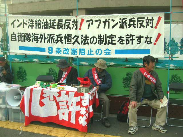 臨時国会で新テロ特措法(派兵給油新法)の延長の審議が大詰めを迎えているなか、「派兵給油新法延長反対!第6波国会前集会」が、11月18日の12.30〜13.30まで参議院議員会館前路上で行われた。呼びかけは「憲法を生かす会」「全労協」など市民・労働団体で、「田母神前・航空幕僚長のとんでもない論文問題をわずか一度の参考人喚問で終わらせるな。重要法案の強行をする前に国会は解散して民意を問うべき」などと訴えた。また9条改憲阻止の会の人たちも「インド洋給油延長反対! アフガン派兵反対! 自衛隊海外派兵恒久法の制定を許すな!」のスローガンの横断幕と共に、粘り強く座り込み抗議活動を続けていた。(大地実) 写真(9条改憲阻止の会)