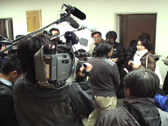 1月6日午後、派遣切りされた人を先頭に8つのユニオンが経団連御手洗会長に「公開質問状」を提出する行動が取り組まれた。質問内容は、「キヤノン・トヨタなど経団連の会員企業の乱暴な非正規職解雇の結果、社会不安が増大した。市民や自治体が奔走しているのに、あなたたちは何もしないのですか?」というもの。メンバーらは、交歓会が開かれているホテルニューオータニに乗り込んだ。受付ロビーはマスコミを含めた100人以上で埋まり、ホテル側は大あわて。経団連が受け取りを拒否したため混乱がつづいたが、ホテル側が質問状を預かることで決着をみた。御手洗会長も派遣切りされた人の怒りを身近に感じたにちがいない。(M) 公開質問状・写真1・写真2・写真3・フジテレビ・TBSニュース *写真=公開質問状を手に会場に向かう(手前は妨害するホテル側)