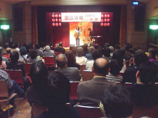 文化のチカラで改憲を止めようと07年に結成された「憲法寄席」創作集団が、3月1日、都内で「2009年春席」を開催した。会場は180名で満杯。李政美ミニコンサートを間にはさんで、朗読劇「やまねこ裁判」と「具沢山の寄席鍋」が初上演された。「やまねこ裁判」は裁判員として召集される国民がどんな体験をさせられるかをリアルに表現し、その怖さを伝えた。「寄せ鍋」では「麻生内閣冬景色」をはじめ9曲の替え歌・漫才・ワーキングプア川柳の構成で、政府や派遣切りの大企業を痛烈に風刺した。「蟹工船 次は楢山 節考か」など川柳は身につまされるものばかり。笑いの中に、時代の危機を感じさせる舞台だった。(M) 他の写真・動画「麻生内閣冬景色」 *写真=「寄せ鍋」のフィナーレ