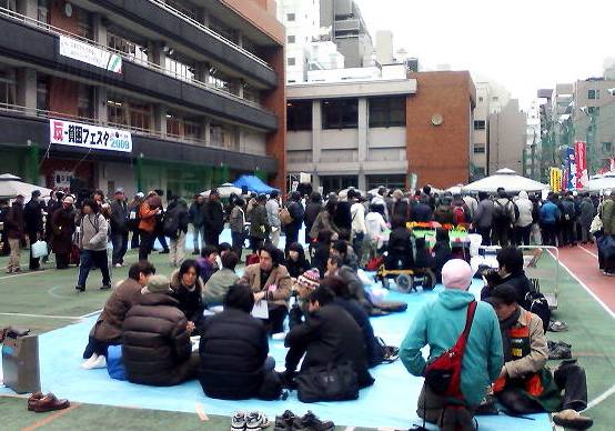 3月28日、反貧困フェスタ2009が東京・神田一橋中学校で開催され終日賑わった。炊きだしでは、たくさんの野宿者が列をつくり「年越し派遣村」を彷彿させた。参加人数は約1700名で、若者から年配者まで幅広く、多様な人々が交流するフェスタとなった。午後は体育館でシンポジウム「いま"はたらく"が危ない」(写真)があった。ここでは、派遣切りされた人などから労働現場の生々しい実態が語られた。また連合・全労連・全労協・市民団体の代表による討論があり、批判や注文も含めた熱いディスカッションがあった。閉会集会で、反貧困ネット代表の宇都宮弁護士は「シンポの中で“労働組合と市民運動の出会いが派遣村を成功させた”という話が出たが私もそう思う。これからも相互の連携を強め、人らしい働き方ができる社会をつくろう」と呼びかけた。 写真1(オープニング)・写真2(レイバーネット)・ワーキングプア川柳あつまる・写真3・写真4・