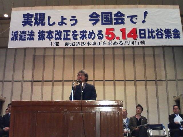 5月14日夜、派遣法の抜本改正を求める集会が東京・日比谷野音で開催され、約1000名が集まった。「登録型派遣禁止」で野党の足並みが揃いはじめ、共同法案提出が視野に入るなか、民主・社民・共産など各党代表から力強い挨拶が続いた。呼びかけ人の鎌田慧さんは「きょう発表された08年の自殺者数をみると若い世代が急増している。国民が生死のぎりぎりに置かれ、希望を失うこんな社会でいいのか。この社会は変えるしかない」と訴えた。また大分キヤノンはじめ、勇気をもって立ち上がった派遣労働者の発言に、惜しみない拍手が送られた。参加者は、寒風をついて国会へ請願デモを行なった。 写真1(鎌田慧)・写真2(会場)・写真3(現場発言)・写真4(コール・国会デモ)・JANJAN報道