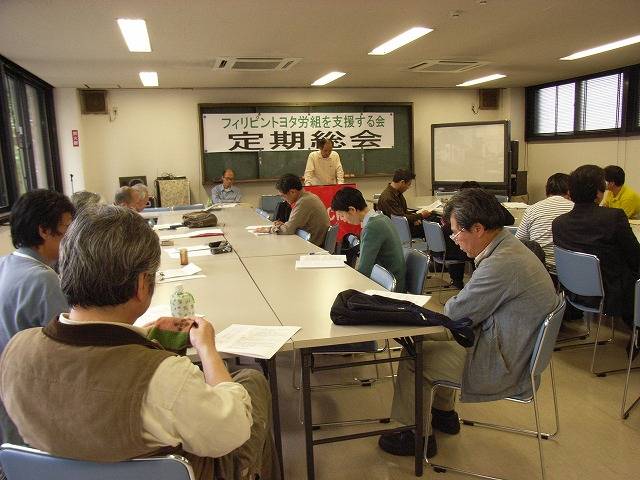 トヨタ自動車のフィリピン子会社は、労働組合(TMPCWA)を結成した(2000年)直後のストライキを理由に組合員233名を解雇したが、組合はトヨタと政府に対して今も闘い続け、3月16日に不当解雇8周年の抗議行動を行った。フィリピントヨタ労組を支援する会は5月16日、2009年度総会を横浜で開き、20人が出席した。当該労組(TMPCWA)が厳しい軍隊の弾圧を跳ね返し不屈に闘い続ける中で、支援する会は社長交代が近づくトヨタを解雇撤回、組合承認に追い込むための活動方針を決定した。総会後、酒井徹さん(名古屋ふれあいユニオン・運営委員長)が「今、トヨタの足下で」と題して講演。彼はトヨタの期間工や派遣労働者の経験を元に、トヨタの下請けで外国人労働者や実習生がいかに非人間的な労働を強いられているか、それでも日本に来て働かざるをえないフィリピンや中国などの母国の労働者の状態を告発した。支援する会総会(全景)・酒井講演音声ファイル(30分)・酒井徹の日々改善