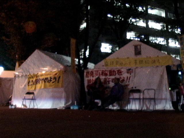 「経産省前テントひろば」を守ろう!〜右翼・警察の連日の妨害つづく 「経産省前テントひろば」は脱原発運動のシンボルであり、貴重な集いの場になった。しかしここ数日、右翼・警察による嫌がらせ・妨害行為が激しさを増している。11月9日、テントひろば運営委員会は声明を出して支援を呼びかけている。以下声明から。「妨害に抗議するとともに、みなさまへさらなる支援を呼びかけます。9月11日に“人間の鎖”が経産省を包囲した直後に、経産省本館前に反原発テントが建てられて2か月が経ちました。テントは3つに増えて今も24時間の泊まり込みが続いています。3.11の福島原発事故を受け、脱原発や福島への補償を求めて動き出した多くの人が出会い、話し合い、行動するための場として広がり続けています」 声明全文・テントひろばHP・11/8夜の写真・asobunさん写真・ひろば日誌(11/9) *写真=11/9午後テント前