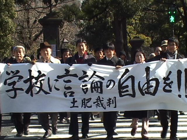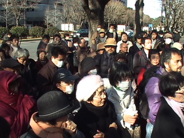 都教委に異議申し立てした男〜三鷹高校元校長・土肥信雄さんに不当判決! 東京都教育委員会の「職員会議で挙手・採決禁止」通知に、異議申し立てした三鷹高校元校長の土肥信雄さんが定年後の再雇用を拒否された事件(通常97%が再雇用)の東京地裁判決が、1月30日午後1時半にあった。傍聴に入れない数十人の人々は、地裁入り口で報告を待った。三鷹高校の教え子や教員、保護者など2年4ヶ月の裁判を熱心に支えてきた人たちだ。まもなく報告者が出てきて垂れ幕を広げた。「不当判決」の文字が掲げられると支援者から「ふざけるな!」の大声が飛んだ。ミニ報告が始まる。いつもは笑顔を絶やさない土肥さんも厳しい顔つきで、「ウソをつく人間が勝ち、正直者がバカをみる。こんな日本にしていいのか」と激しい怒りを表明した。古久保裁判長の判決は、原告の主張をいっさい認めないもの。土肥さんは「不当判決。これを機にますます闘う」ときっぱり述べた。(M) 動画(湯本雅典)・渡部報告・写真(入場)・写真(報告を聞く支援者)・土肥校長及び弁護団の声明 *写真=地裁前で報告する土肥さん(右)