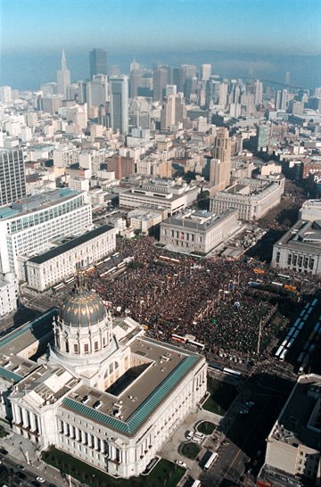 政府はテロ高度警戒「コード・オレンジ」を発動し、市当局もデモ行進に許可を与えないという状況の中、2月15日、ニューヨークでは50万人の人々がブッシュ政権のイラク攻撃に反対するため、国連本部前の反戦集会に結集した(ニューヨークIMC、IMCラジオ)。ニューヨーク以外にも、サンフランシスコ30万人(16日)、ロサンゼルス10万人、シアトル6万人、ミネアポリス・フィラデルフィア・サンディエゴなど全米200都市でプロテストが展開された。その中にはテキサスなど保守的な地域も含まれている。アメリカでは1月19日にもワシントンDCやサンフランシスコで数十万人規模の反イラク戦争デモがおこなわれたばかり。 ニューヨークのプロテストには、ニューヨーク・ワシントンDC・ニュージャージー・マサチューセッツなどから多数の労働組合メンバーも参加した。集会ではSEIU(Service Employee International Union)(サービス産業の組合)-、ローカル1199(医療部門のローカル)のデニス・リベラ委員長、CWA(Communications Workers of America)メディア・IT産業の組合)のレイニー・コーヘン執行副委員長、AFSCME(American Federation of State, County and Municipal Employees)(州郡市の公務員組合)-地区会議1707(ニューヨーク市職員部門)のブレンダ・ストクリー委員長(NTCLAW=ニューヨーク反戦労働連合呼びかけ人)ら、AFL-CIO加盟組合のリーダーたちもスピーチに参加。デニスSEIU1199委員長は「私たちはこの戦争を止めようとしている・・・ローマで、バルセロナで、ロンドンでデモ行進ができるなら、ここニューヨークでも私たちは行進できる」と語った(16日付ワシントンポスト紙)。NYCLAWのマイケル・レットウィン氏は「これほど広範な反対の声が戦争前に起こるということを、私たちはこれまで経験してこなかった。この規模は、おそらくベトナム戦争の末期か、あるいは第一次世界大戦期のデモに匹敵するでしょう・・・ブッシュはこうした声を考慮しているでしょうか。彼らは何も聴こうとしません。しかしそれにもかかわらず、彼らに選択の余地はないのです」(16日付ボストン・グローブ紙)。SEIUローカル1199は反戦医療労働者の集会を行ったあと、街頭で集会参加者に防寒帽を支給するなどしてプロテストを支えた。