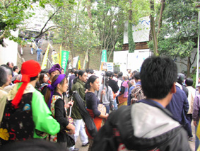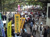 2001年国際反戦デーの全国一斉行動 国際反戦デーの10月21日(日)、日本全国の平和グループが反戦・平和を訴える一斉行動を行った。呼びかけたのは「テロにも報復にも反対!!市民緊急行動」を主催する日本消費者連盟、許すな!憲法改悪・市民連絡会、市民のひろば、の各団体。この一斉行動には北海道から沖縄までの全国33カ所での集会・デモがネットワークされ、各地で報復攻撃反対、自衛隊参戦反対の声があがった。 東京六本木にある桧町公園には呼びかけに応じた市民、労働者およそ2000人が集まった。集会で平和を願う歌やスピーチが行われた後、人々はアメリカ大使館に向けて列を作って歩きだした。報復攻撃が既に開始されたためアメリカ大使館は警備が厳重で立ち入ることができなかったが、デモ行進はそのまま外務省へと向かった。先頭も最後尾も見えないほど長蛇の列を作った隊列は、戦争反対の声をあげながら、霞ヶ関を包み込んだ。 by hr Created byStaff. Created on 2001-10-21 22:19:28 / Last modified on 2005-09-05 02:58:28 Copyright: Default | ||||||