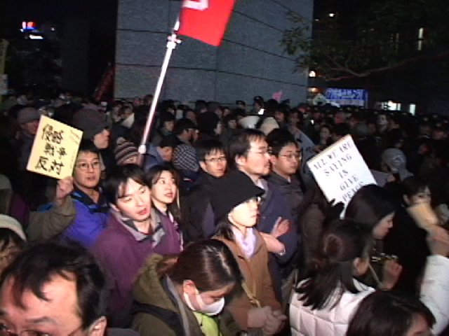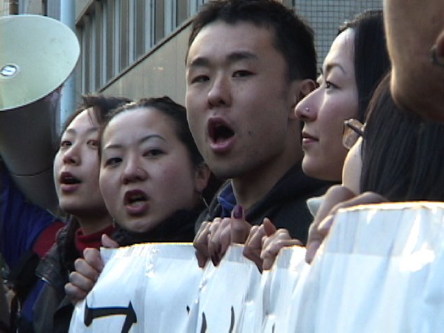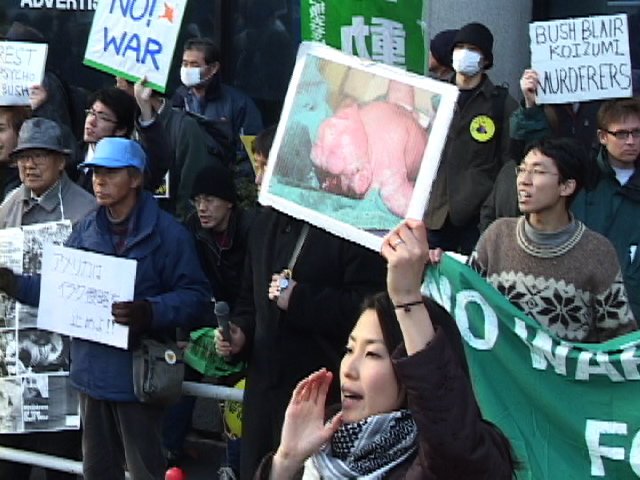 声を上げよう! きょうが始まりイラク攻撃が始まった3月20日、米大使館前には続々と怒りの市民が集まってきた。空爆が始まった11時30分には警察官によるごぼうぬきの強制排除が行われたが、その後三々五々に再度結集した。人数は時間が経つごとに増え300名近くに達し「戦争ハンタイ」」のコールが響きわたった。だれが仕切るわけでもない。集まってきた人たちは、自由に交代でマイクを握ってそれぞれの思いを訴えた。高校生・アメリカ人・在日韓国人・ジャーナリスト・宗教者など本当にいろいろな人たちだった。車イスで朝7時半から来ていたという女性もいた。「友人は人間の良心を信じて“人間の盾”としてイラクで頑張っている」という報告には大きな拍手があった。ある人はこう訴えた「あれだけ頑張ったのに戦争を止められなかったことは悔しい。でも終わりではない。私たちにできることは声を上げること。それをみんなで実行しよう。そして必ず戦争を止めよう。きょうは始まりだ」。 大使館周辺は、機動隊と警察車両で「戒厳令」状態だった。道路は封鎖され、午後6時すぎに集まってきた人たちはほとんど警察の阻止線に阻まれた。まったく根拠のない阻止線に対して、市民は強く抗議し騒然とした状況が数時間続いた。逮捕されたという情報もある。とにかく予想をこえるたくさんの人がこの日、米大使館に抗議にやってきたのだ。怒りは大きくそして深い。〔写真下〕 Created byStaff. Created on 2003-03-21 01:53:47 / Last modified on 2005-09-05 02:59:13 Copyright: Default | |