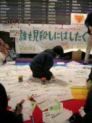 12日の行動の要約(片柳) 「やれることをどんどんやろう」今日から平日となったが、仕事があるにもかかわらず、500人がお昼の国会集会 にやって来た。「アルジャジーラTV局にメールを送りました」、「政府が足を引っ 張っている。おかしな発言をするな」、「第二のベトナム戦争です」、「命が大事と いうことをこの時くらい痛感することはありません」などの発言が冒頭からなされ、 内容も具体的行動提起を伴ったものが多くなって来ている。国会議員は、議員個人が 署名集めを開始し、自衛隊撤退を要求する方向で動きはじめた。 家族はアルジャジーラTVに向けてのメッセージを作成、「家族の顔を確認させてく ださい。身代わりが必要なら喜んでなります」と政府の冷たい仕打ちで不安を隠し切 れない中でも必死の訴えを続けている。 昨日、アルジャジーラTVのあるカタールに到着したNGOはアルジャジーラTVに生出 演し、イラクのために尽力している仲間なのだと直接声を届けることができたとい う。同NGOの日本メンバーは「自衛隊を送ってしまったことが間違えだったと今訴え ないでいつ訴えるのか」と自衛隊の即時撤退を強く訴えた。 また、「NGOの世界ネットワークが全世界に広まっている」「署名が広がって行く のを見て、平和が望まれているのだと力強く思う」という実感が多くのNGOから発表 された。そして「ファルージャの子どもたちの命も守って行きたいと考えている」 「ファルージャでどんな酷いことがおこったか、イラクの人の命も救わなければなら ない」という皆の願いが確認され、これからも、イラクの皆さんに日本の様子が伝わ るようにどんどん情報を送っていこうということを誓いあった。そして、「日本のテ レビの報道が間違っていると思ったら、テレビ局に電話して抗議しよう、良い報道と 思ったら誉めてあげよう、それが正しいTVの見方です」とマスコミ対策の方向性も示 された。 最後に、せめて「政府は(人質解放の)邪魔をしないで」という訴えが相次ぎ、 「国民の命より軍隊を選んだ小泉首相は辞任すべき」という意見で一致した。 夕方の集会は、「政府、評論家の言っていることは全く事実と違う」という批判か ら始まった。国会議員自らからは「政府の責任は大きい」とのコメントもあった。 アメリカ・ニューヨークに住んでいる方からは、「ニューヨークの世論は、自衛隊 がイラクに行ったことを何も評価していない。感謝などしていない。それどころか、 一体いつ故郷に帰れるのかと心配し、自殺も増えている」というメッセージが寄せら れた。 また、中学生が挨拶にたち、「学校で緊急のビラを作ってまきました。学校で『自 衛隊は即時の撤退を、3人の命を守ろう』というフリートーク集会をやります。3人 の命を守るのは自衛隊の即時撤退をすることです」と発言をした。それを聞いて大人 の側は「大人も中学生に負けずに頑張りましょう」と発言。若者の素直な行動に皆心 を動かされていた。 最後に、「イラクの人を殺すな」と言いながら、首相官邸に向けた外でのシュプレ ヒコールに移った。 ところが、ここでトラブルが発生した。本日、アメリカからチェイニー副大統領が 来日している関係からか、数百人の警察官が壁を作ったため一歩も前に進めなくなる という事態となった。この事態に参加した1100人は一斉に抗議のシュプレヒコー ルをあげた。そして暫くの混乱を経た後ようやく前に進むことができた。 官邸に向かっては「自衛隊は撤退しろ」、イラクの皆さんに向かっては「イラクの 人たちが自分たちの手で担っていけるように手伝って行きたいんです」と私たちの メッセージを今日も訴え続けた。 明日は、夕方6時国会前です。 さらに、行動は続きました。 渋谷では10代20代の若者が中心に思い思いの抗議行動を行っていて、この日 は、小泉首相にメッセージを届けようという企画が考えられ、A4サイズの紙に、平和 ・生きることに関するテーマの絵や文書を書いてもらっていた。道行く人は次々と メッセージを書き込んでいた。そして、地面いっぱい壁いっぱいにメッセージが集ま り、周辺はちょっとした美術館?と見間違うほどの作品の山で埋め尽くされた。 メッセージの内容を紹介すると「3人の命より米を優先したことを絶対に忘れない ぞ、首相としてあるまじき判断だと思います。」、「軍隊や兵器では平和はつくれな いと思います」、「武器なくして心で解決を」・・・。このメッセージは明日、首相 に届けられる。 この企画は、メッセージを届けようという想いから、皆で行動している間に自然に 発生したものだという。集まっているメンバーも、偶然に集会で顔を合わせただけの メンバーだという。いわば全くの見知らぬ若者どうしが、「なんとかしなくちゃ!」 という想いだけでやり遂げた企画。それにしても、なんだか塗り絵みないな感じで、 立ち行く人も次々と吸い込まれるように参加できる気軽さもあり、たくさ