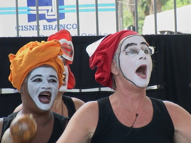 顔を白塗りした女性だけの劇団「リラの馬鹿騒ぎ」が、路上で「もう一つの世界は」というお芝居をしていました。アメリカ合衆国の製薬産業が、ブラジルで見つけた薬を買い漁るパーフォーマンスが大うけでした。最後に俳優たちが、「もう一つの世界は」と呼びかけると、観客が「可能だ!」と叫ぶ趣向でした。 | |