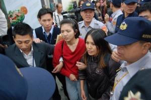 台湾・松山空港と羽田を結ぶフライト便の就航を祝うイベントで、日航の不当な解雇に抗議する客室乗務員や空港労組が抗議の声を上げた。写真はイベントに突入して連れ出される解雇乗務員。