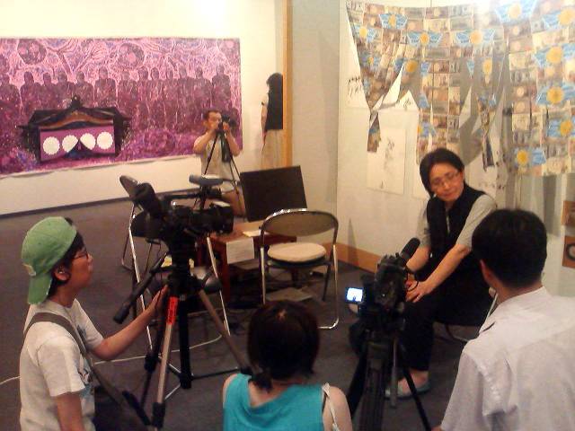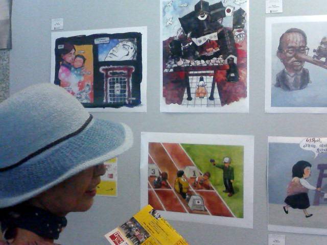 8月9日、靖国キャンドル行動のイベント「アートで表現する YASUKUNI」が東京・日本教育会館で開催された。韓国・台湾・沖縄・日本の4地域のアーティストたちによる展示や韓国学生による「風刺漫画展」があり、約100名が参加した。リレートークでは「ヤスクニと表現」「東アジアと天皇制」をめぐって議論。韓国の作家・ホンソンダムさん(写真下)は「想像してほしい。600万を虐殺したヒトラーの息子がドイツの大統領になることはありえない。しかし、2千万を殺した天皇の息子はいまだに天皇だ」と日本の戦争責任のあり方を痛烈に批判、「この問題解決こそがアジアの希望につながる」と述べた。(M) ↓美術展入り口 ↓ホンソンダムさんの作品「靖国の迷妄4ー知覧の夜」 ↓インタビューに応じる作家のアンソングムさん ↓池田龍雄さんの作品「散りそこねた桜の碑」 ↓美術展に訪れた韓国・元総理のハンミョンスクさん(右) ↓風刺漫画展 Created by staff01. Last modified on 2008-08-10 22:07:48 Copyright: Default | |
