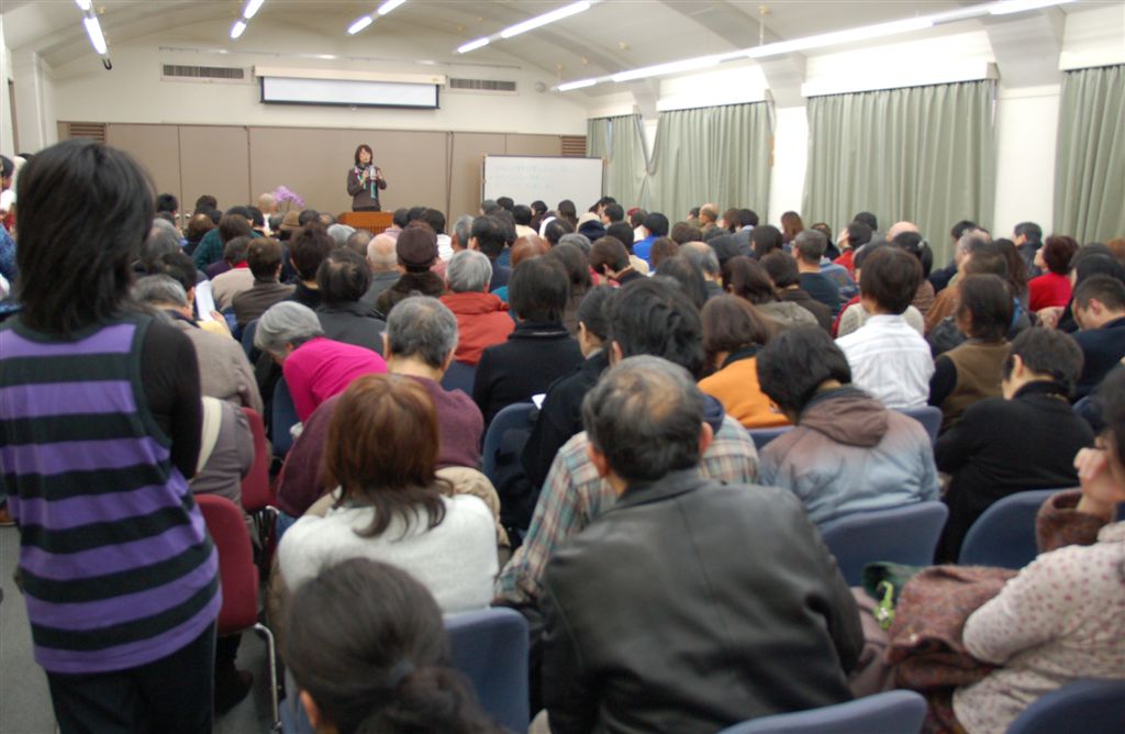 岡真理さん(京都大准教授・現代アラブ文学/写真上)が講演。「ガザは21世紀の絶滅収容所だ。私たちは、公然と行なわれるイスラエルの攻撃に沈黙することで、自分自身の責任として、殺りくに青信号を出したのではないか。彼らの共犯者になってしまうのではないか」と厳しく問いかけた。パレスチナとイスラエル国家、シオニズムの歴史を解き明かしながら、占領政策の理不尽や不正義を、怒りを込めて告発した。(Y=報告と写真)