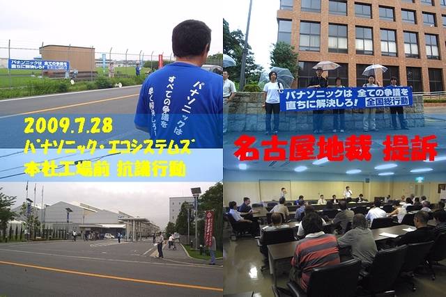 パナソニック総行動IN愛知 8団体30人の結集で大爆発!! 名古屋地裁へ、38ページに及ぶ訴状を提出 この日(7月28日)の行動は、全国パナソニック総行動(呼びかけ パナソニックPDP原告・吉岡力、パナソニック電工福島原告・佐藤昌子、パナソニックエレクトロニックデバパン原告・河本猛)の一環として取り組まれました。早朝7時半から、春日井市にあるパナソニックエコシステムズ工場労働者へ、約30人の仲間がビラ撒きとマイクアピールを行い、400枚のビラを渡すことができました。 11時には愛知連帯ユニオンの「派遣労働者」2名がパナソニックエコシステムズに直接雇用関係の確認を求めて提訴、中谷雄二弁護士と野口新弁護士の書いた訴状は、38ページに及ぶものになりました。訴状は、「労働契約における直接雇用の原則」「労働契約とは何か」から説き起こした、ひとつの「論文」ともい えるような立派な内容です。パナソニックの職種偽装が意図的なものであることを厳しく断罪しています。11時半からは司法記者クラブで原告と弁護士らが記者会見を行い、複数の新聞に報道されました。 集会後、午後からは、「愛知県ユニオン統一行動」として、争議先への抗議行動、名古屋駅ミッドランドスクエア前街宣を行いました。この日の参加団体は、愛知連帯ユニオン、笹島日雇労組、名古屋ふれあいユニオン、女性ユニオン名古屋、ゼネラルユニオン東海支部、ATUサポート市民の会、管理職ユニオン東海、それに大阪のなかまユニオンなどです。社民党の平山さんも宣伝カーで応援に来てくれました。 (報告・愛知連帯ユニオン) Created by staff01. Last modified on 2009-07-30 11:55:43 Copyright: Default | ||||||