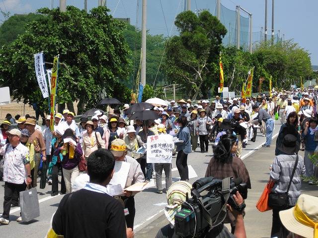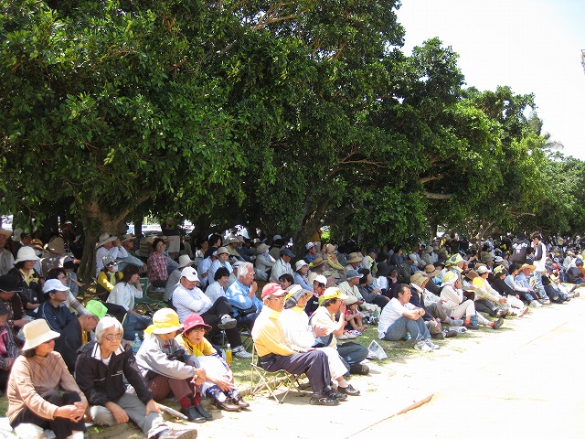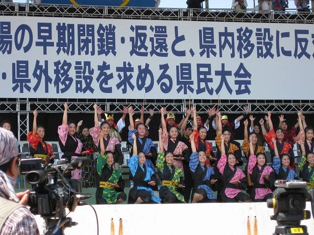 *以下のレポートは4/26に寄せられましたものです。編集部のメールトラブルで入稿漏れとなり、掲載が大変遅れたことを筆者にお詫びします。(編集部) 写真↓「つくろう平和な未来。伝えよう沖縄の心」。現代版組踊「肝高の阿麻和利」を演じるうるま市の中高生ら。 現地からのレポート(続報) 我謝 香織 「えー、人がでーじ、いっぱい(おい、人が本当にたくさんいる)。これから先、ここにこんなに人がいるってないあんに?(これから先、こんなに人がいるってないんじゃないか?)」「まじでや。読谷祭りの何倍か?(本当だな。祭りのときの何倍かな)」 4月25日、読谷村での県民大会が始まる前、広場の向かいにある建物の二階から人でいっぱいの広場の写真を撮っているとこんな会話が聴こえてきた。会話の主は2人の地元の男子高校生(だと思う)。坊主頭と毎日の部活で日焼けしている野球部員といった風情だった。 開会の二時間ほど前に会場には到着した。大会の開始は午後3時だったが、プレイベントが午後1時から始まっていた。沖縄は芸能の島。ステージでは地元の歌手が民謡やオペラ、ラップなどを歌った。地元の子供たちも空手の演武を披露した。トリを飾ったのは海上の埋め立て案が浮上しているうるま市の中高生らの現代版組踊「肝高の阿麻割和利」。地元勝連の英雄・阿麻和利が主人公の物語だ。最後に全員で「未来のために僕たちも頑張る。つくろう平和な未来、伝えよう沖縄の心」と声を合わせてメッセージを発信した。 「沖縄の基地は県民が望んだのではない。では誰が望んだものか。国民全体で安全保障の痛みを共有しないで日本国民一人一人は自立できるのか」 「復帰後に限っても米軍基地に起因する事件・事故は約6000件。2、3日に一度は沖縄のどこかで県民が巻き込まれている。憲法下での人権が保障されていない」 「小学校へのジェット機の墜落事故、原子力潜水艦の寄港など市民は危険と隣り合わせだ。新たな基地は容認できない」 「普天間基地の危険除去は絶対に必要だが、県内移設の条件付きでは永遠に解決できない。駐留していた国の8割で政権交代のあと、米軍は撤退している。米国もそれは分かっているはずだ」 「辺野古のおじい、おばあたちが14年間、頑張ってこのうねりをつくりだした。日本の民主主義を取り戻し、沖縄県民の人権を取り戻す戦いだ」 「埋め立てで補償をもらってもそれは一時のもの。海は枯れることのない湧水だ。豊かな海を残せば頑張った分、もうけさせてくれる。金をもらって埋め立てさせますか?!」 壇上で代表者らが決意表明をすると会場からは「やさ!(そうだ!)」との声や拍手が沸き起こる。代表者と会場に集まった参加者らが同じくするのは「子や孫、未来のために米軍基地の被害と負担を残さない」という気持ちだった。 「大会が終わったころにやっと会場に着いた」「バスに4時間、乗っていました」。大会翌日の今日(4月26日)、お昼を食べながら同僚らは話した。会場周辺は大会終了後も会場へ向かう人たちで大渋滞が起こっていた。「未来のために」と沖縄県民が一丸となり、普天間基地の県内移設にNO!を突き付けた大会。今後、どのような対応をするのか、日本政府、日本の民主主義が問われることになる。 ↓大会一時間前。参加者がぞくぞくと。 ↓日差しを避けて日陰で待機。 Created by staff01. Last modified on 2010-05-04 10:51:43 Copyright: Default | ||||||