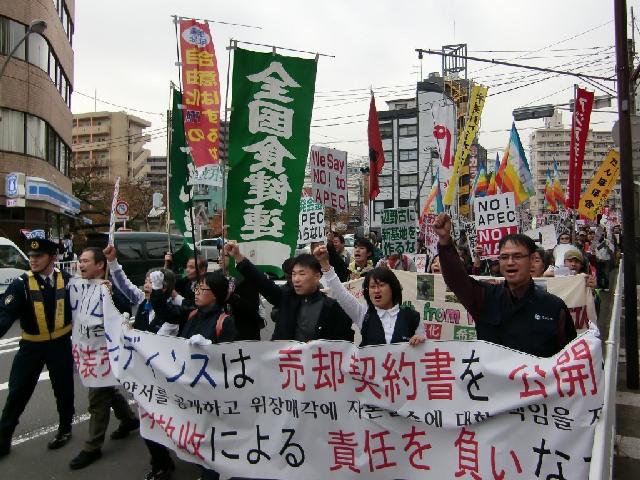 APECに反対して現地横浜で開催されている「いらない!APEC 横浜民衆フォーラム」が13日午後、街頭アピールとデモ行進を行なった。1時30分から桜木町駅前広場で集会を開催し、2時30分きっかりにデモに出発した。約500人の参加者は、「APECは失敗しろ!」「世界を民衆の手に取り戻せ」などと訴えながら、思い思いのパフォーマンスを繰り広げ、警備陣21000人の厳戒態勢に屈せず、会場の最短地点まで肉薄。約2時間の道のりを最後まで果敢に歩きとおした。(Y) ↓市民と制・私服警官で緊張感に包まれる駅前会場 ↓車道には赤旗が林立し、歩道には神奈川県警の青ベストの一団 ↓コースには「静穏保持法」の指定エリアも。ここでは拡声機の使用が禁止された ↓会議会場にもっとも近づく地点には、重装備の部隊が並び、デモ隊は歩道にすらあがれなかった Created by staff01. Last modified on 2010-11-14 01:24:34 Copyright: Default | |