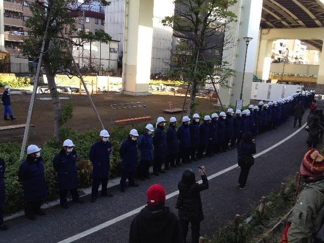 12月5日午前、東京・江東区の竪川河川敷公園で野宿者排除の行政代執行が強行されました。これに対し、早朝から約100人の市民が集まり抗議の声を上げました。代執行対象地は、前日までに更地になっていたにもかかわらず、区職員・警察・警備員あわせて200人以上が押し寄せ(写真上)、代執行と無関係なフェンスでテント群を封鎖しました。しかし、当該の野宿者・支援者・市民の力で野宿者の居住空間は守られました。(K)