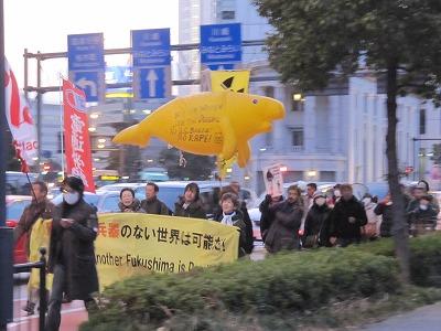 欧州議会議員のレベッカ・ハルムスさんはドイツはフクシマ事故後すぐ可動原発の半分8基の原発を停止したが、8カ月経過して電力不足も価格高騰もなかった。日本政府は世界中の専門家の協力を求め福島の犠牲者のために、世界のために共に学ぶプロセスを開始すべきだと訴えた。飯田哲也氏はフクシマ原発の事故は世界史に残る。日本は戦後に代わる「フクシマ後」の時代が始まった。石油、核に代わる太陽による平和をめざそうと訴えた。オーストラリアのウラン鉱山のために被曝している原住民代表のピーター・ワッツさんは採掘ウランがフクシマにも輸出されていたと報告。そして、1945年の広島原爆で被爆者を治療した肥田舜太郎医師はフクシマ事故の日本にはもはや被曝から安全な場所はないと警告した。