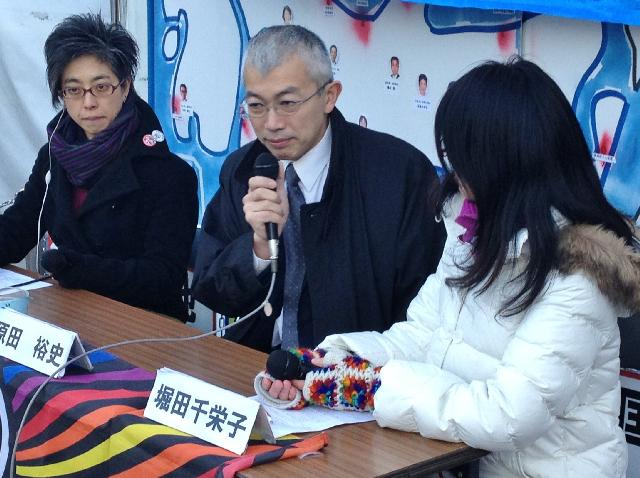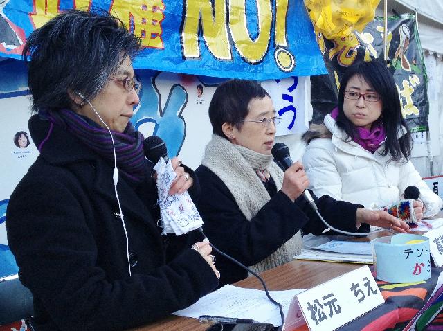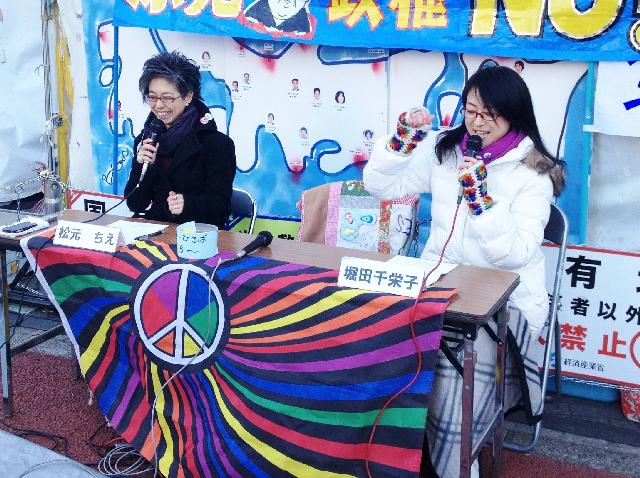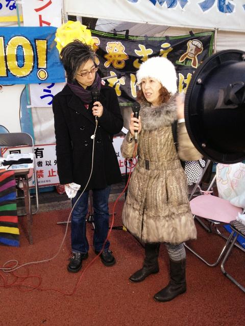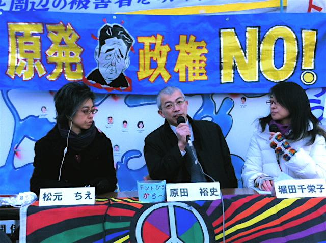 夫も父も原発で働いていた〜「あおぞら放送」で冨岡町の避難女性が語った18日の<テントひろばから〜>のUST放送で、富岡町から避難している女性がインタビューに応えてくれた。夫も父も原発で働いた。夫は地震直後に、政府発表以前に「メルトダウンするから遠くへ」と言った。助かった。しかし5月に「招集命令」すぐに線量が限界に達して断念。一度摘出したガンが再発。また、福島原発建設に関わった父親(80歳)は、原発がこんなことになって「あの時は村のため、みんなのためだと信じて原発建設にかかわったけど、こんなことになったのは、オレらのせいなんだ」と重く責任を感じていた。その償いに80歳になってからも除染作業に出かけたという。(松元ちえのツイッターから) ↓とにかく寒い、手足がかじかんでくる。きょうも頑張るキャスターの二人 ↓東京のガレキ問題 高瀬幸子さん ↓ジョニーHの替え歌(いつも新曲) ↓原田裕史さん、反原連運動を語る ↓大阪のガレキ問題と弾圧について 道下啓子さん ↓通りすがりコーナー *上の写真 撮影=杭迫隆太 ーーーーーーーーーーーーーーーーーーーーーーーーーーーーーーーー Created by staff01. Last modified on 2013-01-19 21:49:01 Copyright: Default | |