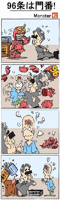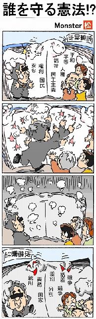 「Monster松」氏は、福島県教組の機関誌「福島県教育新聞」に毎号漫画を投稿している福島県の中学校教員(数学科教員、避難区域の浪江町住民)。震災前から漫画を描いてきたが、震災後はさらに画風に切れ味を増し、漫画で福島県の学校現場からの東電、国、福島県の責任を追及する声を代弁し続けている。(湯本雅典)