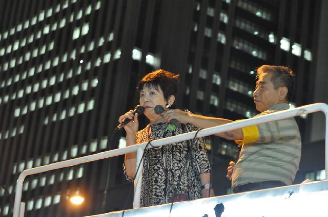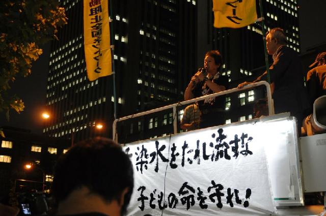 3.11から二年半、経産省の角地にテントが出来てから三年目を迎えた9月11日夜、経産省は怒りのヒューマンチェーンで包囲された。「汚染水は完全にブロックされている」と安倍首相は、世界に大嘘をつき東京オリンピックを射止めた。もちろん「平和と友好の祭典」のためではない。隣国に嫌われ、軍備を増強し、平和憲法を破壊しようとする姿を見れば明らかだ。なぜオリンピック招致のように政府・経済界・マスコミ一丸となってフクシマの汚染水対策にあたらないのか。悔しい思いをしているのは福島の人たちだけではない。この日、福島はもちろん、泊、若狭、川内、伊方など遠方から経産省に再稼働をやめ、経産省・エネ庁は東電を解体し、汚染水対策に専念するよう抗議・申入書を持参した。しかし経産省は門前で対応した。この国の主権者は誰だ。(報告・写真=Shinya) ↓「テントひろば満2年を迎えたが、祝うべきものとは言えない。汚染水対策は外国の技術援助も受け入れ国政の第一優先にすべきだ」テント代表渕上さん。 ↓「イヤだと声をあげたくても、原発がなければ生きていけないようにさせられた住民の気持ちが分かりますか!」若狭から来た女性はマイクを握り、経産省に向かって叫んだ。 ↓「川内原発のある南九州は、世界でも希な火山地帯。万が一事故が起これば偏西風に乗り日本列島は放射能まみれになる。」鹿児島から駆けつけた男性。 ↓制服向上委員会も駆けつけ替え歌「オオズサンナ」を歌い会場を沸かせた。 ↓「いまも毎日2億4千万ベクレルもの放射性物質が環境に放出されている。一日平均3000人の原発労働者の7割が福島県民です。かれらの多くはピンハネと充分な防護もなく被ばくしながら作業しています。」原発いらない女たちの会・佐々木慶子さん。 ↓「いつも一緒に助け合ってやって来た。」と金曜行動のミサオ・レッドウルフさん。 ↓「テントひろばと金曜行動は全国の反原発運動の希望の灯になっている。世界も注目している。東電は3600億円も使って柏崎を再稼働させようとしている。」たんぽぽ舎の柳田さん。 ↓怒りのヒューマンチェーン ↓能登の漁師からテントひろばに贈られたキリコ(灯籠)。能登の漁師は絵がうまい。 Created by staff01. Last modified on 2013-09-12 21:55:46 Copyright: Default | |