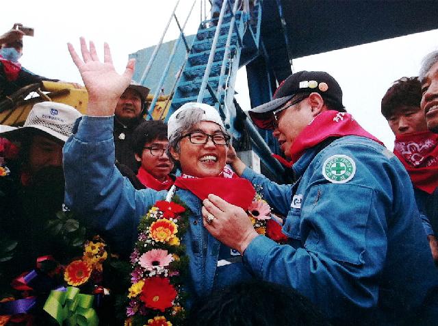 2011年11月10日、韓進重工業は整理解雇を撤回。キムジンスクさんは、309日目に地上に下りました。しかし会社は、約束不履行と労組弾圧を繰り返し、労組の闘いは続いています。