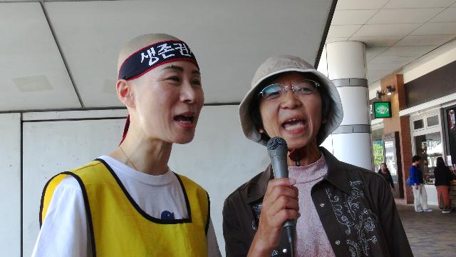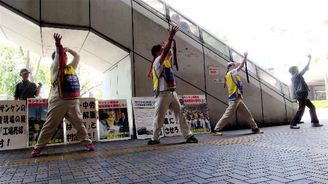 大詰めにきた韓国サンケン労組のたたかい〜5/22から緊急集中行動半年以上に及んだ韓国サンケンの整理解雇撤回の闘いは、大詰めの段階に来た。韓国の中央労働委員会で4月28日「解雇不当」が認められ、事態が大きく動きはじめた。18名の組合員は家庭の事情などで、やむなく会社の希望退職に応じたが「破格の金額」を獲得した。また残った組合員には「復職命令」が出た。5月12日から16名が職場に戻ったものの「追い出し部屋」で仕事が与えられていない。また「謝罪・補償金・生産部門の再開」の問題が未解決で、交渉が続いている。5月末には株主総会があり、韓国サンケン労組は22日から連続「特別緊急行動」を行い、一気に会社に全面解決を迫る方針だ。21日には社長宅のある東京・田無駅頭で情宣活動を行なった(写真)。リーダーのキムウニョンさんは「みなさんのおかげでここまで来た。必ず勝つ!」と満面に笑みを浮かべた。(M) ↓情宣活動のはじめに「サンケン首切りやめろ」の替え歌をうたう。左=キムウニョンさん、右=尾澤邦子さん(通訳) ↓締めはユルトン Created by staff01. Last modified on 2017-05-21 22:56:28 Copyright: Default | |