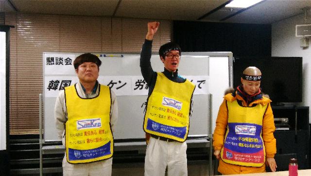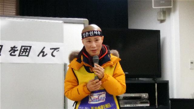 「私たちは未来に向かっていく人間だ」〜毅然として闘う韓国サンケン労組尾澤邦子韓国から海を越え、日本のサンケン電気本社に対して「解雇撤回」「職場復帰」を求めて遠征闘争を行っている韓国サンケン労組。10月来日からすでに100日になる。寒さ厳しい中で、毎朝の出勤闘争、東武東上線「志木」駅頭情宣、毎水曜日昼休み池袋メトロポリタンビル前での海外営業部に対する要請行動、川越工場門前での宣伝行動など行っている。労組からじっくり話を聞きたいと、1月14日懇談会が東京ボランティア・市民活動センター会議室で行われた。 出席者は約40名でほぼ満席だった。開始前、映像スクリーンには「10万集まれば情勢を揺るがせる。50万集まれば労働分野の改悪を阻止できる。100万が決起すれば世の中が変わる」という民主労総ハン・サンギュン委員長の、獄中書簡からの言葉が映し出されていた。 韓国サンケン分会解雇者復職闘争委員会議長のキム・ウニョンさん(写真上)が通訳をいれて約1時間、「韓国サンケン分会の現況と闘い」について、またパワーポイントを使ってこの間韓国で闘われているパク・クネ退陣のろうそく抗争について話した。話は、今まで民主労総が引っ張ってきていた市民運動が、ひとりひとりの闘いで、旗もそれぞれ独創的な旗を創って持ってくるというような国民が引っ張る闘いに発展し、民主労総として新たな社会への政治ビジョンを提示しているという、とても刺激的な内容だった。女性で髪の毛を全て剃ってハチマキを巻いて闘う姿には、とても驚かされるが、話の内容は緊張感と重みのあるものであり、またここまで考えているのかと教えられた。労組指導部としての毅然とした闘う姿勢に、韓国労働運動の核心を見るような思いがした。 キム・ウニョンさんは韓国サンケンで26年間働いてきた。韓国サンケンは韓国の南、慶尚南道昌原市の馬山自由貿易地域にある。埼玉県新座市にあるサンケン電気が1973年に100%出資して設立した子会社だ。1970年から1987年、馬山自由貿易地域には自由貿易特別法があり、労働組合の活動は禁止されていた。しかし、民主化を求める87年の民衆抗争には多くの労働者が立ち上がり、労組を作り、先頭に立った。労働者の権利を保障せず、多くの利潤を上げてきた外資企業は撤退を始めた。韓国スミダやシチズン、韓国山本などのように、民主的な労働組合に加入しようとすると会社は撤退した。現在馬山自由貿易地域には労組のある企業が30くらいになってしまった。その中でも民主労総に加盟しているのは韓国サンケンのみ。そのことによるさまざまな嫌がらせなどがある。 97年には日本での株主総会で、韓国サンケンの生産部門をインドネシアに撤退させるという決定が出された。労組は1年半闘い、決定を覆させた。インドネシアに工場はできたが、韓国からの撤退はなかった。2000年には労働者は400~500人に増員され、黒字続きだった。しかし2007~2011年には構造調整があり、300~400人がリストラされた。2015年原因不明の火災が起こった。生産部門のある2階はなんでもなく、廃棄物のある1階と労組事務所のある3階が燃えた。それから解雇へのシナリオが稼働した。労組は解雇阻止のため、あらゆる努力をした。国会議員、道・市議会議員、地元チャンウォンの市長も解決に乗り出した。しかし会社は全く応じなかった。社長は、労働者の解雇を撤回すると、自分の首が飛ぶと言っていたようだ。 2016年6月、日本での株主総会で、韓国サンケンの生産部門の廃止、外注化が決まった。韓国サンケンは本社の指示がなければ何もできない。労組は責任者である社長に直接会って話をするために日本に来た。12月27日には韓国の地方労働委員会で、解雇は不当であるとの判定が出た。「私たちは中労委でも裁判でも勝てると確信している」とウニョンさんは話した。 続けて、2016年ろうそく抗争の話に移った。抗争の原因として、若者の貧困、就職難、自殺率の高さ、労災の多さ、解雇を自由にできる労働法の改悪、正規職を追い出して非正規職になどの問題をあげた。2014年のセウォル号事件では、子どもたちが沈んでいく姿を、テレビで見ているしかなかった。「そのような怒りがたまり、破裂していくようだった」と話した。抗争の特徴、到達点、発展方向と課題など適格な指摘であるように思った。そして、民主労総が新たな社会へのビジョンとして、政治ビジョンとしての主体的な大統領選挙の勝利、また新たな社会の労働ビジョンとして、働く人々が労働基本権、経済基本権、政治基本権を持つことを掲げていることを紹介した。 ウニョンさんは「世の中を変えようとするならば、今組織されている労働者の量的・質的発展が必要だ。また87年6月の民主化闘争のあと労働組合が多数設立されたように、闘っている大衆が入ってこれる民主労総に変わるべきだ」と話した。最後に「あなたができると思えばできるし、できないと思えばできない。私たち