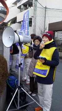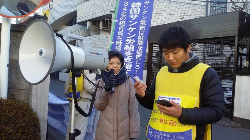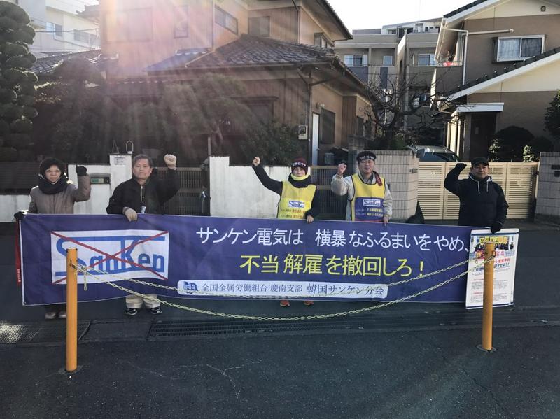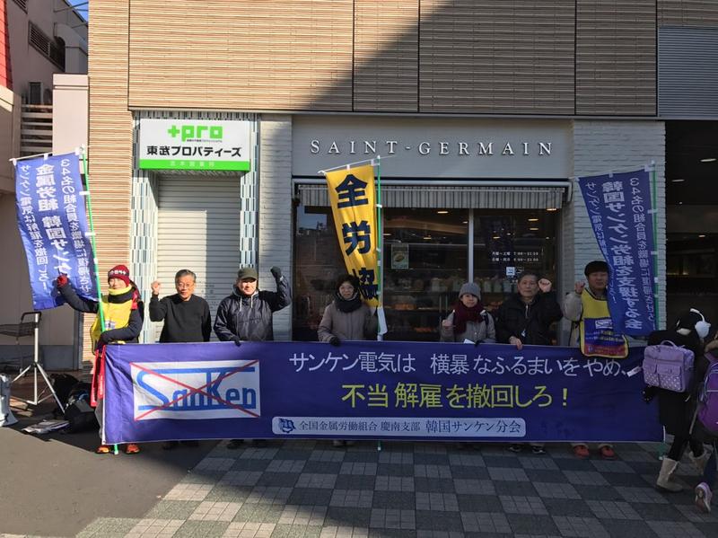 7時15分〜8時半までマイクでの情宣。新しく来たメンバー二人と帰国する二人を交え、「イムのための行進曲」を歌って行動開始。支援も6人でにぎやかだった。ウニョンさんと、帰国する二人がマイクでアピール。年末年始を日本で過ごすしかなかった悔しさと、必ず勝って職場に戻る決意を語っていた。 ユルトンの先生のヨンジンさんが帰ってしまうので、「もう一度前へ」のユルトンを新人二人と踊ってもらい、ビデオで撮影した。 いざお別れとなると寂しいもの。ウンジュさんがウルウル泣き出した。みんなで「勝ってまた会おう!」と励ました。 二人を送り、9時半まで社前座り込み。新人二人に韓国の様子など質問。「馬山の工場は海からの風が冷たく寒い」「年末年始も会社前のテントを、ローテーションを組んで守ってきた」など話してくれた。 伊藤課長が出てきた。「池袋に行く」とのこと。「解雇撤回」「話し合いを行え」と強く要請した。 10時〜11時、志木駅頭情宣。足を止め、サンケン電気への抗議ハガキに署名してくれた方がいた。 車で移動し、川越へ。 11時50分〜13時、川越工場門前で宣伝行動。食堂に移動する社員にマイクで訴え。警備員が一人、「中に入らないでください」と厳しい顔をしていたが、ほかに動きはなかった。 (以下の画像をクリックすると拡大表示します)