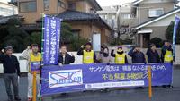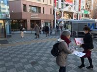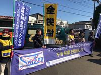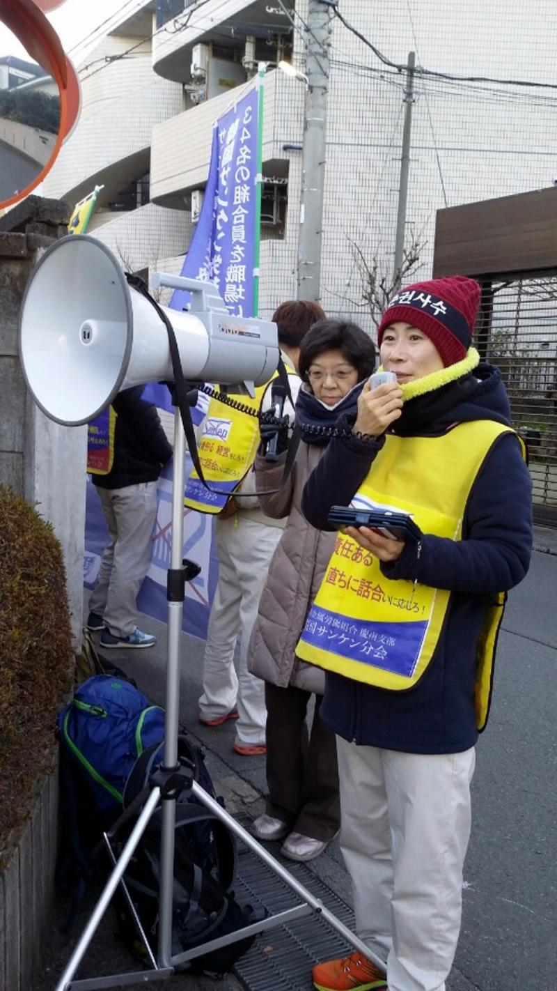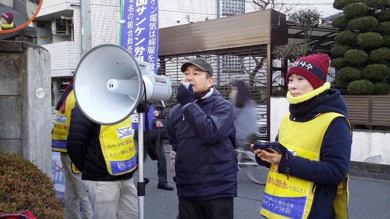 快晴でそんなに寒くない2017年最初のサンケン電気社前抗議要請行動。「解雇撤回」の新しいチラシを社員に渡そうとしたが、なかなか受け取ってくれない。社員との壁は厚い。