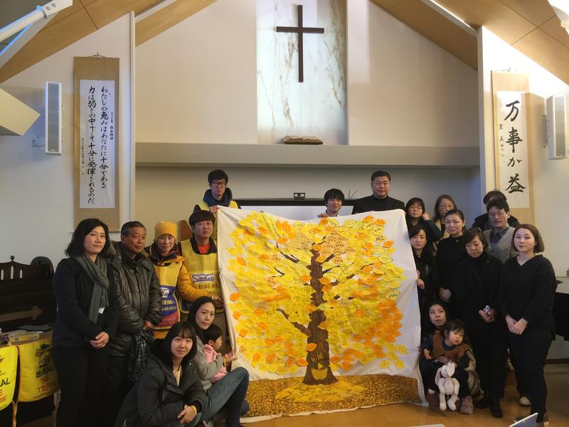 向島キリスト教会で、あの日のことを忘れない、真実究明などを求めて映像を見たり、亡くなった子どもたちの名前を葉っぱに書いて大きな木を作りました。