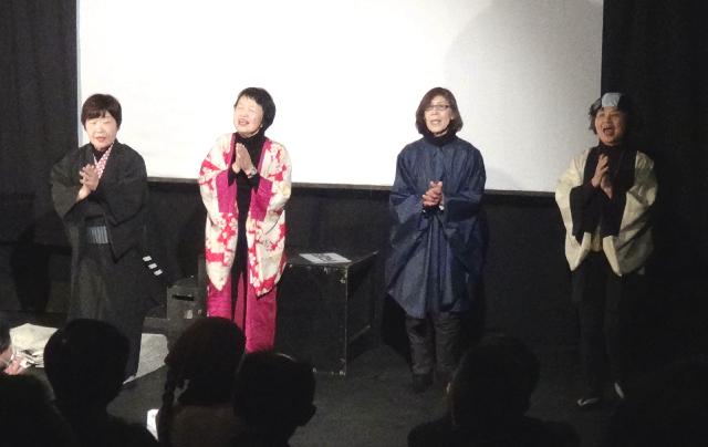 5年のたたかいをドキュメントした映画は大好評で、「涙が出てきた。感動した。ポレポレ東中野でやってほしい」「自分のところで上映会をしたい」の声が寄せられた。この日はあわせて、評判の寸劇『女三人吉三(おんなさんにんきちさ)』(10分)も上演された。2度目のお披露目で磨きのかかったメトロレディー4人の熱演に拍手喝采が飛んだ。じつはこの台本を書いたのは「新小岩ZAZA」メンバーの大場吉晃さん(写真下・中央)。「33年振りに台本を書いたが反響が大きくてとても嬉しい」と満面の笑顔だった。また派遣雇止めに遭った渡辺照子さんも参加し「一緒にたたかいたい」とアピールした。