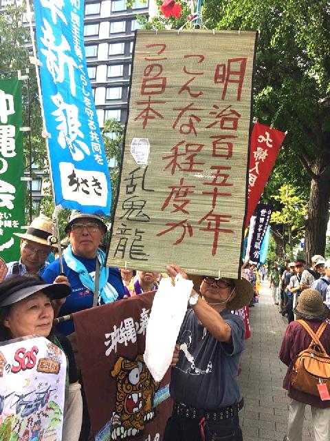 翁長さんの遺志を受け継ぎ県知事選勝利へ〜安倍9条改憲NO! 8.19国会議員会館前行動に2700人8月19日夕方。私にとって久しぶりの国会議員会館前は、変わらずにとりどりの幟や横断幕に埋められ、チラシを配る人たち、スピーチに合わせて「そうだ!」と合いの手を入れる人たちで埋められていた。何人もの顔なじみのお元気な姿に、お互い声を掛け合う。 遅れて到着した私の耳に、トップに話している立憲民主党の菅直人さんの締めの言葉が飛び込んでくる。菅さんは「3.11以降、原発をなくしたいと国内外を回ってきたが、世界中に原発が必要と思っている人はいない。太陽光・風力で電気はまかなえる。早く政権を変えよう」と訴えていた。 次は、共産党の宮本徹さん(写真上)。昨日まで沖縄にいたということで、辺野古の南側の工事の遅れを指摘。それは40メートルの地盤の緩みがあるからと報告。続けて「安倍は沖縄の基地は、北朝鮮が攻めてくるからと言っていた。でも政局は動いたので、もう基地建設の名分はなくなったのだから、今度の県知事選挙で新基地反対の知事を選んで新基地をなくしたい」と力強くアピールした。 板橋区の荒川孝治さんは、「許さない!戦争法オール板橋行動」の取り組みとして、「板橋区の中に、生活のこと政治のことが気楽にしゃべりれる場が必要ということになった。そこで、今そういう場づくりをしている」と現状報告をする。 大村芳昭さんの、安保法制違憲訴訟の現状説明のあと、北海道から来た小林久公さん(写真上)の市民連合の活躍がみんなの関心を引く。昨年の衆議院選挙でのこと、北海道全体で22人のうち8人を当選させることができたと活動仲間の結束を語ると、あちこちから「ウォー」と称賛の声。 次期の国政選挙でも北海道で統一候補を立てると宣言。続けて、選挙では必ず勝つことが大事だと。それには「統一候補擁立も一人区だけでは足りない。二人区でもするべきだ」と強調した。我が千葉の選挙区は3人区。現在保守優勢の2対1である。何とか逆転をと思っている身には強い励ましだった。 最後は沖縄から。「沖縄に翁長知事が必要だった。翁長知事を生んだのは、この冷たい政治」と断言。「沖縄はすぐに地方選・知事選に入る。必ず勝つためにご支援を」と結ぶ。そして、♪今こそ立ち上がろう!♪を、参集者たちも声を合わせて高らかに歌った。アベの問題など新しい歌詞も織り込まれ、まったく今の日本を現わしている歌であった。 最後は、議事堂に向かってコール。若い声が議事堂の壁に吸い込まれる。きっとそれは言霊となって、中にいる人々に影響するだろう。「アベ、ヤメロ!」「アソウ、ヤメロ!」。 1時間の集会を終え、官邸前集会のスピーチを聞きながら帰途についた。〔笠原眞弓〕 Created by staff01. Last modified on 2018-08-20 16:50:36 Copyright: Default | ||||||