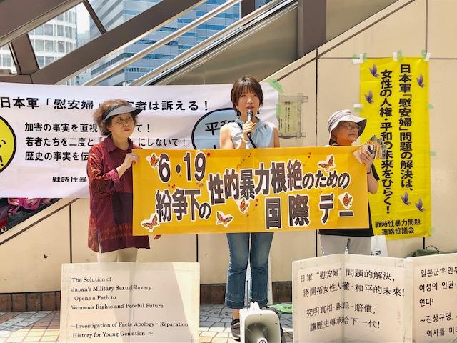 紛争下の性暴力の問題をアピール〜日本軍「慰安婦」問題解決へ!第22回水曜行動in新宿この日6月19日は、「紛争下の性的暴力根絶のための国際デー」でした。新宿西口・小田急百貨店前で、大々的にキャンペーンを行いました。 この「国際デー」は、2015年6月に国連総会で制定された記念日です。コンゴ、シリヤやイラクなどの紛争地で性暴力が深刻となっていることから、紛争下の性的暴力に対して責任の追及や加害者の処罰に取り組んでいくことも国連では決議されています。 日本はこの決議を共同で提案したにもかかわらず、自国が犯した日本軍「慰安婦」問題については全く知らん顔をしたままです! それどころか、日本軍「慰安婦」とされた被害当事者に対して、2度も、3度も苦しめることばかりやっています! この日、配布したチラシには、吉元玉ハルモニと、先日亡くなった金福童ハルモニが、支援してきたコンゴの性暴力被害者たちと交流している写真を掲載。解決されない日本軍「慰安婦」問題と現代に続く紛争下の性暴力の問題をアピールしました。 猛暑の中、いつものようにみんなで「岩のように」を踊り、12時半から開会。オープニング・トークは、池田恵理子さん(wam名誉館長)。池田さんは、NHKの報道問題に取り組んでいること、女性の人権、平和のためにはメディアの姿勢を正していくことも必要と訴えました。 ゲストは、朴金優綺さん(在日本朝鮮人人権協会事務局)。多くの国際場面でも活動している朴金優綺さんは、金福童ハルモニの証言とともに人権問題の国際基準は何か、被害者中心アプローチが必要であることを熱く訴えました。 この日は、第22回の水曜行動in新宿でもあり、25名の参加者が270枚のチラシを配布し、盛会のうちに終わりました。次回の第23回水曜行動in新宿は、7月17日(水)12時半〜13時半です。 Created by staff01. Last modified on 2019-06-20 15:30:05 Copyright: Default |