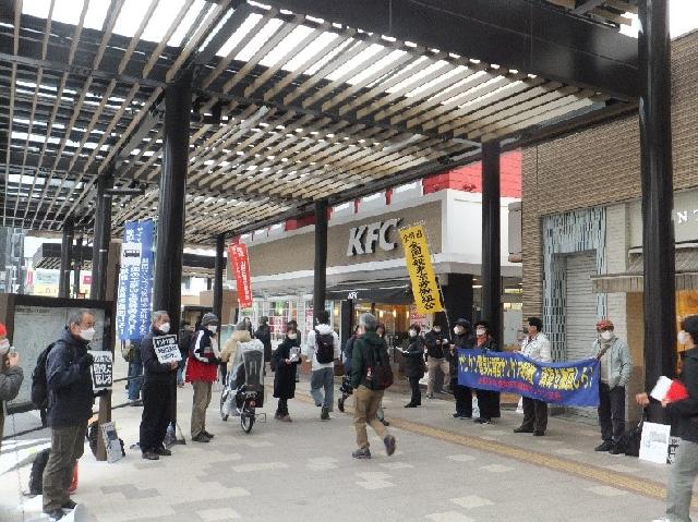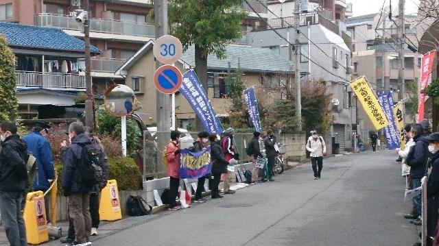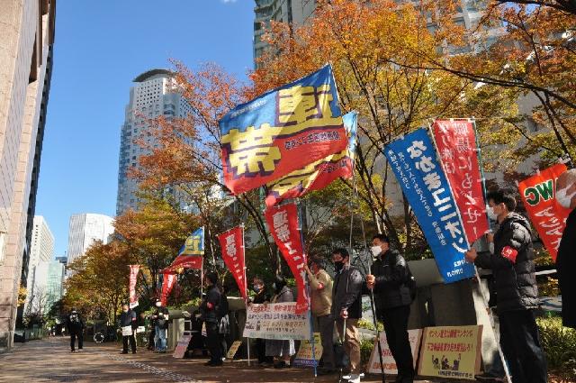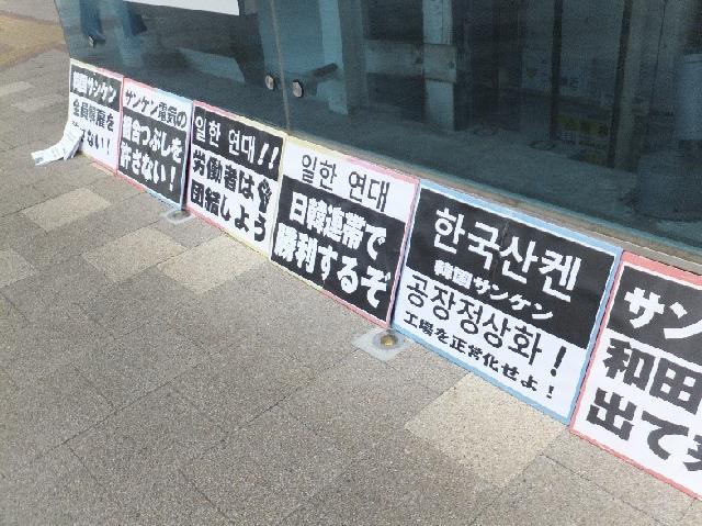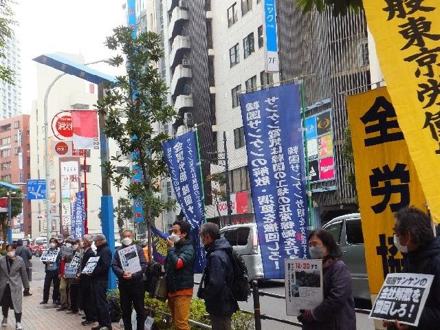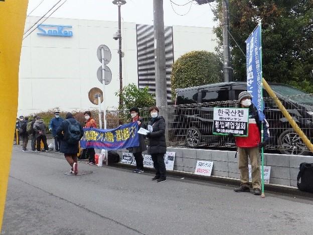 ●韓国サンケン労組を支援する会・12月3日第13回木曜行動報告 大阪・名古屋営業所への抗議要請行動も始まった!サンケン電気は偽装解散撤回を!12月に入った。埼玉県新座市の空はどんよりと曇り、早朝の空気は冷たい。昼に池袋に移動しても、気温は一向に上がらない。しかし、国境を越えてオンラインで届く、韓国昌原市馬山の韓国サンケン工場前のテントで籠城して147日目を迎えた仲間、ソウルで上京闘争を展開する仲間の熱い怒りが、本社前・志木駅南口・池袋東京事務所前で行動する私たちを鼓舞する。12月3日の第13回木曜行動にも、延べ100人の仲間が結集した。 翌4日には、大阪営業所と名古屋営業所に対する抗議要請行動が繰り広げられた。すでに3回目のアクションとなる大阪では、約50人が参加、要請書の受け取りも拒否する営業所に抗議の声を浴びせた。 韓国でも日本でも、支援の輪は確実に広がっている。本社の和田社長は、グローバル資本としてのサンケン電気の企業イメージが決定的に傷つく前に、偽装解散を撤回し、韓国サンケンの工場を再稼働すべきだ。 <7時すぎ サンケン電気本社前「私たちは自らの尊厳を守り抜く!」> 郵政ユニオンの仲間が本社前アピール開始のあいさつ。続いて馬山の韓国サンケン労組の仲間キム・ヒョンガンさんがオンライン・アピール。「90年代に労組が出来るとすぐに会社は工場閉鎖―インドネシア移転を計画したが、組合はこれを押し留めた。それから半年間休業したり、希望退職を何回も募り、多くの労働者が職場を去ることになった。私が入社時には500人もいた社員が数十名になった。そして4年前に整理解雇に踏み込んできた。これも跳ね返したが、今度は会社解散。労組との約束も破った。欺瞞的で許せない。私の心は怒りで一杯。2018年には別会社を設立した。本社は、他の会社にでなく韓国サンケンに投資すべきだ。会社清算で、労働者も家族も涙を流してる」。 ソウルのキム・ウニョンさんが続く。「韓国も数日前から急に寒くなった。コロナの感染拡大と寒さ厳しい中の連帯行動に感謝したい。周辺住民のみなさんにもご迷惑をおかけします。しかし、私たちの生きる権利がかかっていることを、会社が労組との合意と、二度と整理解雇のような事態を起こさないという地域住民のみなさんへの約束を踏みにじっていることにご理解をいただきたい」「サンケン電気は大きな、地域でも世界的にも有数のグローバル企業。1973年に、無償で工場敷地を手に入れて、税制度上も恩恵を受けてきた。当初は労組も禁止されていた。韓国の地で莫大な利益を上げ、日本に持ち帰った。96年民主労総加入で会社解散―インドネシア移転を画策した。解散は今回で2回目。労組嫌いの体質は骨の髄まで染み込んでいる。労組の権利は法律で保証されている。そんなことをグローバル企業であるサンケン電気は知らないのか?労組が怖くて解散するのか?サンケン電気は道理を守れ!労使協定を守れ!私たちは自らの尊厳を守り抜く!」怒りの声がサンケン電気本社に響き渡る。「支援のみなさん、寒い中、体に気をつけて!」。韓国の仲間は発言の最初と最後に、必ず周辺住民への呼びかえと支援のへの気遣いの言葉を忘れない。 埼玉市民の会が発言。「ご近所のみなさん、サンケン電気本社への抗議にご理解を!」。韓国サンケン労組のオ・ヘジンさんのアピールが続く。「私たちとの話の中で、韓国サンケンの社長は『3年前の解雇を撤回させた労組の存在』を本社が解散を決断した理由に挙げた。なぜ整理解雇を撤回させたことが、廃業の理由になるのか!3年前に労働委員会決定を受け入れ解雇を断念したのは会社側ではないか。会社は工場再稼働も約束したのに、嘘とベテンを重ねてきた。今回も解散を労組に正式に通知せず、秘密裏に廃業しようとしている。これで社会的責任を果たしていると言えるのか?なぜ労組と本社の話し合いに応じないのか?」 府中緊急派遣村労組の仲間の連帯発言、本社に向かってシュプレヒコールで締めくくり、志木駅に移動。 <9時 東武東上線志木駅南口 「天も海も労働者民衆の国際連帯を遮ることはできない!」> まず韓国良心囚を支援する会全国会議からアピール。韓国サンケン労組のヤン・ソンモさんから訴え。「会社は今回の会社解散について、本社のホームページに廃業決定を載せるだけで労使協議をしようとしない。抗議の声にも知らんぷりを決め込んでいる。私たちはこの3年間、休業も賃金切り下げも受け入れてきた。3年前の整理解雇の撤回の時の会社の約束を信じたから。工場を再稼働する、重要な決定には労使協議するという約束を、なぜ踏みにじるのか?きちんと手続きを踏んで、人間として和田社長には行動してもらいたい」。 さらにオンライン・アピールは続く。キム・ヒョンガンさんから。「会社は赤字を意図的に作り出し、私たちを解雇しようとしている。 『生産すればするほど赤字になったのは労組の責任があるから』と