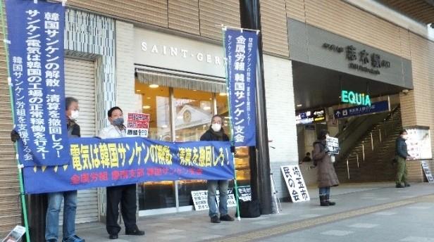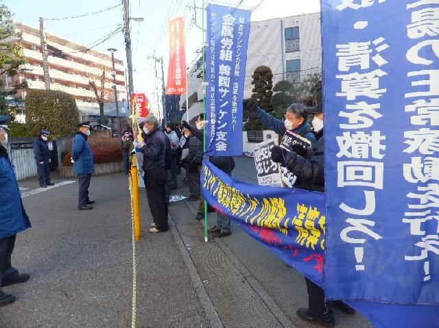 ●韓国サンケン労組を支援する会・2月4日第21回木曜行動報告 「100万民主労総の闘いで、サンケン電気に挑む!」 〜キム・ウニョンさんが民主労総副委員長に選出されました!2月4日(木)第21回木曜行動。新座市内は天気快晴、立春を過ぎ寒さは大分緩んできた。しかし先週と同様に、本社前から志木駅南口、池袋へと移動するにつれて冷たい風が強まり、体感温度は下がる一方。東京事務所前の昼休み集会は強風で幟と横断幕がちぎれそうにはためき、ポールを縮めて何とかしのいだ。行動参加者は延べ100人。酷寒の地から海峡を越えてオンラインで届く韓国サンケン労組の仲間の熱いアピールが響き渡った。 韓国内外での闘いの拡がりに焦りを募らせるサンケン電気資本は、韓国サンケンの廃業・解雇を予定通り1月20日に強行し、電気・水道遮断、「工場売却のためのテント撤去・組合事務所退去」を求める内容証明郵便送達と、矢継ぎ早に労組への圧迫を重ねている。会社側のこの脅迫じみた挑発行為、刑事・民事の裁判をちらつかせてのあからさまなに恫喝に対し、怒りの声が高まっている。2月1日に韓国現地及び新座市内本社前と池袋・東京事務所ビル前で抗議行動が展開され、また3日には大阪営業所への抗議行動も大阪の仲間たちによって取り組まれた。さらに4日午後に馬山自由貿易地域管理センター前で慶南地域対策委員会による抗議行動も展開された(下の写真。慶南新聞から)。 「もはや『16人の労組』だけの闘いではない。民主労総傘下の組合員100万人の闘いでサンケン電気に挑む!」―韓国サンケン労組副支会長のキム・ウニョンさんが本社門前のオンライン・アピールで民主労総副委員長に立候補する決意を明らかにしたのは1月21日の第19回木曜行動だった。2月5日の民主労総第7回代議員大会で、キム・ウニョンさんが民主労総副委員長に選出された(写真)。 キム・ウニョンさんが宣告した通り、今後も韓国での事業展開を継続するのであれば、サンケン電気本社の経営陣は100万民主労総と全面対決することを覚悟しなければならない。いまからでも遅くはない。和田社長は、労組潰しのための偽装解散・解雇を撤回し、韓国サンケン労組に全面謝罪した上で、工場正常化に向けた労使協議を直ちに始めるべきだ。 ≪2月4日朝7時過ぎ サンケン電気本社前「労組との話し合いに応じるしか道はない!」≫ 出勤するサンケン電気社員の中にも、支援する会の配布するニュースを受け取る人が少しずつ増えているように感じる。郵政ユニオンの仲間の発言から木曜行動スタート。「2月1日にも本社前で緊急行動を実施した。サンケン電気のやり方には怒りを通り越して、あきれている。韓国国内での偽装廃業批判の世論の高まりをも無視して1月20日に廃業・解雇を強行したばかりか、テント撤去・組合事務所退去まで求めてきた。この会社の強硬姿勢に抗議して緊急行動も実施した。サンケン電気が事業を続ける気があるならば、労組と話し合いに応じるしか道はない!」。「そうだ!」の掛け声が飛ぶ。 馬山の組合事務所から、韓国サンケン支会長のオ・ヘジンさんがオンライン・アピール。「清算人が、2回目の配達証明で退去を求めてきた。これに抗議して2月1日に緊急行動を展開した。会社は、3年前から不動産会社に工場を売却する準備をしていた。売れないのを組合のせいにしている。籠城テントや組合事務所の物品があるから売れないのだ、と。これまでも老朽化した工場を補修しないのは資金がないから、本社にも要求できないと言っていた。雨漏りする工場を、誰が買うというのか?漏電の危険もあったが、私たちは工場を守ってきた。工場を正常に稼働することを期待していたから、耐え忍んできた。これまでの歳月は何だったのか?悔しくて堪らない。なぜこんな仕打ちを受けねばならないのか?工場を守ろうとしている労働者に、なぜこのような暴力的な手紙を送ってくるのか。本社は韓国サンケンの社長を案山子のように押し立てて、その後ろにこそこそ隠れて奇襲的に会社を解散してきた。その一方で、LGグループと組んでEKEという会社を16億円も投入して買収し事業展開している。私たちはサンケン電気本社と正面から闘う。責任ある和田社長が話し合いに出てくるまで、あきらめない!」。 事務長のキム・ヒョンガンさんが続ける。「私は韓国サンケンに16年通った。一方的にHPで通告した廃業決定は、多くの人に苦しみを与えた。16人の労働者だけでなくその家族もいる。累積赤字が廃業の理由と言うが、その赤字は誰が作ったのか?労働者のせいだと言っているが、とんでもない。労働者は労働力を提供し、賃金を得るのであって、会社が赤字かどうかは関係ない。利益を上げるために他人のことはどうでもよいと考えるのが資本の特質、それがサンケン電気だ。一方的に、奇襲攻撃のように、嘘ばかりついている。清算人にも腹が立つ。清算の残務ではなく、テントの撤去や組合事務所からの退去、トイレの