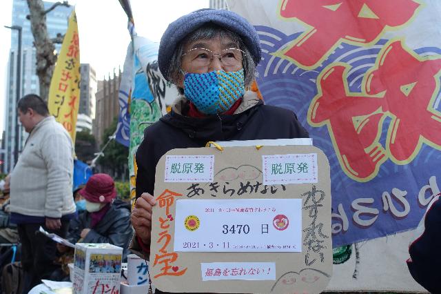 原発問題は完全に決着がついている!〜鎌田慧さん「脱原発」へ熱いスピーチ*東電前。撮影=ムキンポさん 福島第一原発事故から10年目の3月11日、都内では、16時から「とめよう!東海第二原発 日本原電本店抗議」、17時から「経産省前抗議」、そして18.45から「東京電力本店への抗議行動」が取り組まれた。 経産省前の行動では、脱原発テント座り込みメンバーが次々に思いを語った。この日でテントが建てられて3470日、2016年に強制撤去されて1664日が経った。10年のうち前半5年がリアルテント、後半5年が座り込みテントだった。 主催者挨拶で三上治さんは「今でも連日の座り込みが続いている。何の意味があるのか?と問う人もいるが、経産省前での監視活動は間違いなく、再稼働を簡単にやらせない状況をつくっている」と語った。 ジャーナリストの鎌田慧さんがマイクを握った。83歳とは思えない元気な声で、10分間のスピーチをした。 「いま脱原発の世論は8割で、原発は危険と思っている人は9割に達している。福島の双葉や浪江は人が住めなくなってしまった。もう原発問題は完全に決着がついている。メルケルのように毅然と脱原発の道を進むべきだ。しかしこの経産省は懲りていない。すべてカネで解決しようとしている。正義も論理も倫理もない。原発の利権を守る人生なんてつまらない。もうやめてくれ! カネだけの原発推進の政治を変えるために、皆で力をあわせていこう」。 鎌田さんは怒りのまなざしで、経産省を睨みつけた。(M) Created by staff01. Last modified on 2021-03-12 09:23:54 Copyright: Default | |