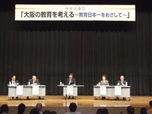 就任のその年、10月、11月と2回にわたって「教育を考える府民集会」(写真下)が開催された。私は、その会場で初めて“ナマ”の橋下氏を見た。集会自体は様々な意見が交わされ意義のあるものだったが、それよりも、私はそこで“テレビが生んだ”橋下知事の手法を目の当たりに見せつけられた思いがした。それはこんな場面だったーー会場からの多くのヤジが起こったことに対して、橋下氏は一喝し、こう述べた、「みなさん、見てくださいよ。これが大阪の教員なんです。こんな人たちに大阪の教育を任せられますか」と。会場からの声は教員ばかりではなかったろうが、一方的にそう決めつけた。驚くのはむしろその後であった。橋下氏は、まるでその後はもう自分の仕事は終わったとでもいうように発言らしい発言はほとんどせず、脱力状態でただ座っていたのである。