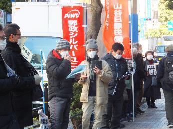 南池袋のサンケン電気東京事務所のI氏と面談してからビル前の歩道で、昼休み集会。埼玉市民の会の仲間の発言からスタート。冷たいビル風が吹きつけ、幟や横断幕が引きちぎれんばかりだが、42人を超える仲間が集まる。