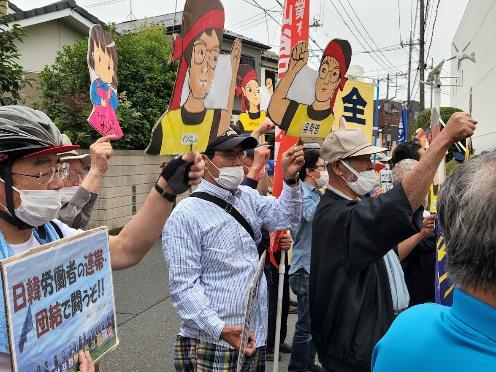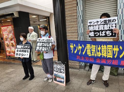 ●韓国サンケン労組を支援する会・6月16日 第85回木曜行動報告 LG電子の会社の敷地前にテントを建てて籠城闘争!6月16日、株主総会を1週間後に控えた木曜行動、梅雨空でやや肌寒い陽気で本社前行動が始まった。敷地内に真新しい縦看板が設置された。「当社敷地内に付き無許可での立ち入りを禁止します。」と書いてある。きっと、株主総会対策であろう。警察からの指導だろう。卑劣な公権力の行使である。どこまで卑劣であるのか!株主総会に向けて、サンケン電気の製品を扱うビジネスパートナー企業への訪問が大体終わった。株主総会の議案書に掲載されている企業を一つ一つ巡って、サンケン電気の悪辣さを訴えた。どの企業も、丁寧に受付で対応してくれ応接コーナーに招き入れてくれ話を聞いてくれた。警備員が出てきて入構を妨害する会社など1社もなかった。当たり前のことが今回のビジネスパートナー企業では行われた。サンケン電気がいかに異常な企業であるかが再認識した。外資系企業として韓国のみならず日本でも不遜な態度を取り続けているサンケン電気は、企業イメージを自ら落としているのに早く気が付くべきである。 株主総会の当日、本社に向けた大抗議行動を展開する。大阪からも支援の仲間が駆けつけてくる。韓国サンケンの仲間がオンラインでその大抗議行動に参加するが、近いうちに本人たちがサンケン電気の社前に姿を見せるであろう。会長や社長は待っているが良い。 ≪6月16日 7時過ぎ 本社正門前≫「通勤通学を急いでいる市民の皆さん。それからサンケン周辺にお住いの住民の皆さん。朝からお騒がせして申し訳ありません。心苦しく思っています。しかしながら私どもがこの様にせざるを得ないと言う事は是非とも理解してくださればと思います。私は韓国サンケンで19年間働いてきた労働者です。韓国サンケンで働きながら20代30代を過ごし、今では40代に入りました。その19年間の間様々なリストラ、さらには解雇攻撃がありましたけれど、それに抗しながら、そうしたきっちりとした物量を私達のはたらく工場に届けるようにと言う事を絶えず訴えてきました。そうした中、サンケン本社は5年前に私達働く労働者のうち生産職だけをターゲットにして整理解雇をするという不当な攻撃をかけてきました。5年前の私たちに対する不当な解雇攻撃は、最終的にはこれが不当であると認められ撤回されました。そしてその中で会社側と合意を結びました。2点に渡ってです。1つは雇用問題に深刻な問題が生じたときは労働組合と話し合いその合意に基づいて対処すると言う事。それから、工場の正常な稼働のために全般的な努力を行うと言う事でした。しかしサンケン本社は私達との合意、すなわち約束を守りませんでした。合意を結んでから3年間の間、只々私達が働く韓国サンケンの工場をなくすための緻密な計画を立てそれを密かに実行していたのです。約束を守らないサンケン本社のせいで、私達はまたもや不当に解雇されて路上にたたき出される、そうした憂き目に合いました。私達はそうした悔しい思いを何としてでも晴らすために、本社に対して不当解雇を撤回し、そしてまた働く場所をもとに戻せと言う要求を掲げてきました。そうした抗議の声を上げてからすでに700日を越えました。本社との話し合いを実現するためにここソウルにあるサンケンコリアの事務所を訪れて、本社との間の中継ぎをして、本社と私達労働組合が話し合いが出来るよう努力してほしいと言う要求を、これまで毎日行っています。しかしサンケンコリアもまた、ここサンケン電気本社と同じ態度をとっています。私達の要求に一つも耳を貸さず黙殺し、会う事すら拒否しています。人間には良心、そして常識があるのではないでしょうか。もしそうであるとすれば、自分の会社を訪れてきた人間に対して、このように徹底的に無視すると言う事はないはずです。サンケンコリアが私たちの要求を徹底的に無視すると言うのは、サンケン本社からの指示があるものと私たちは見ています。そうでないとするならば、どうしてサンケンコリアが、本社と同じ態度を一貫して取り続けるけることが出来るでしょうか。私達の要求はただ一つです。サンケン本社がそして、サンケンコリアが今回の事態を解決するために私達労働組合との交渉に、交渉の席に着くと言うこの一点です。しかしそうした要求を一切無視するサンケン本社のそうした姿勢は逆に私達の闘いに更に火を付けることになっています。この様に私達に対して、酷い仕打ちを続け、また無視を続けるそういった非常識な態度を取り続けるのであれば、私達の闘いはますます強化されなければなりません。私達はこれまでと同様に、自分たちの要求が貫徹されるまで闘いを続けます。私達が闘いに疲れて、やめてしまうだろうと言うのは全くの誤解です。そういった誤解は始めからしないでください。私達は最後まで闘います。最後に今日も