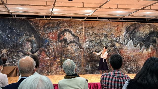 ステージを彩った山内若菜さんの絵とトーク。「一度目はあやまちでも 二度目は裏切りだ。死者たちへの誓いを忘れまい」を体現していた。栗原貞子のことを、多くの人に知ってほしい。ぜひ再演してほしいと思う。