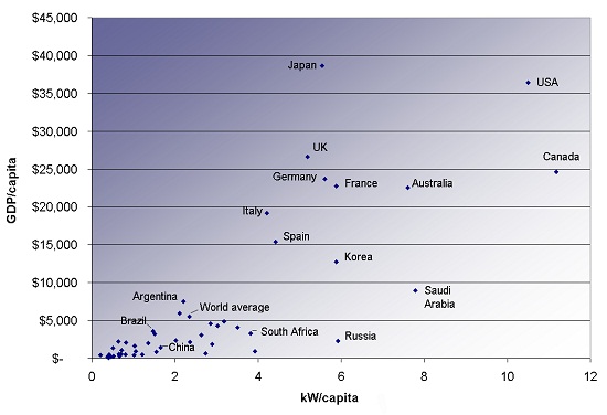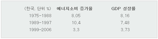 ▲人口当たりエネルギー消費量の図。色が濃いほど1人当りのエネルギー消費量が多い。[出処:BP Statistical Review of World Energy] 韓国は、GDP成長率とエネルギー消費成長率がほとんど同じで、これはどの項目 が原因なのか結果なのかが分離できないほど相関関係が高いことを示している。 経済学では、投入された単位エネルギーあたりの生産への寄与を示すエネルギー 生産性(GDP/エネルギー)という指標があり、韓国生産性本部が発表した資料に よれば韓国/米国/日本とも経済成長率が低いほどエネルギー生産性も低かった。 これは経済成長率が低い年にむしろ経済成長率よりもエネルギー消費増加率が 高かったことを意味する。家計の所得は増加しなかったのにエネルギー消費が 増えたのは、その増加分が生産に投入されたことを示唆する。ここに2008年、 世界で使われたエネルギーの51%が産業(生産)に使われ、家庭で使われたのは 18%しかなかったという事実を結合させれば、エネルギー消費の増加は生産の 拡大による結果と言う方が正確だという点が分かる。