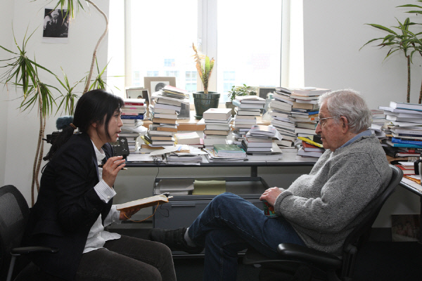 ノーム・チョムスキー教授(右)が自分の研究室でアン・ヒギョン氏とインタビューをしている。